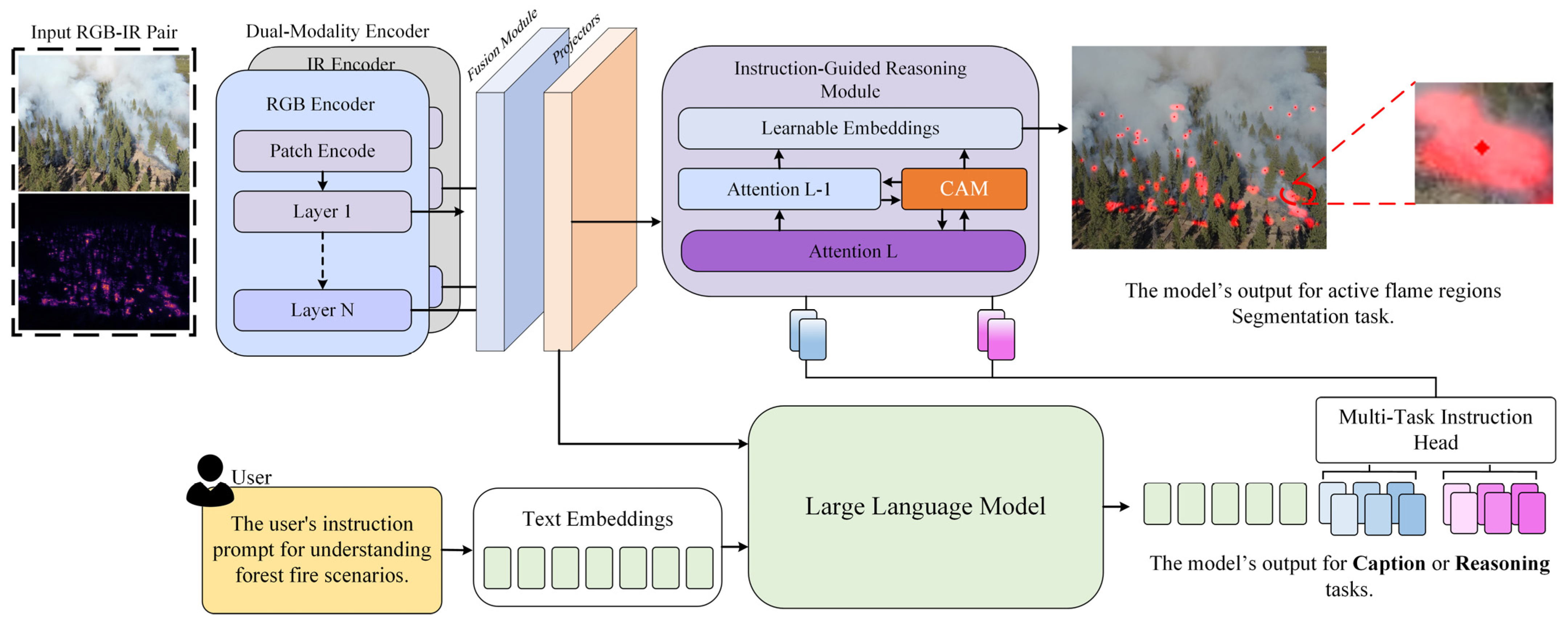 | FireMM-Instruct (ours), 2025 | UAV, Aerial (unified from FLAME series) | Paired RGB–IR Radiometric | No | Yes | Classification; Captioning; Reasoning; Segmentation; | 83,000 pairs |