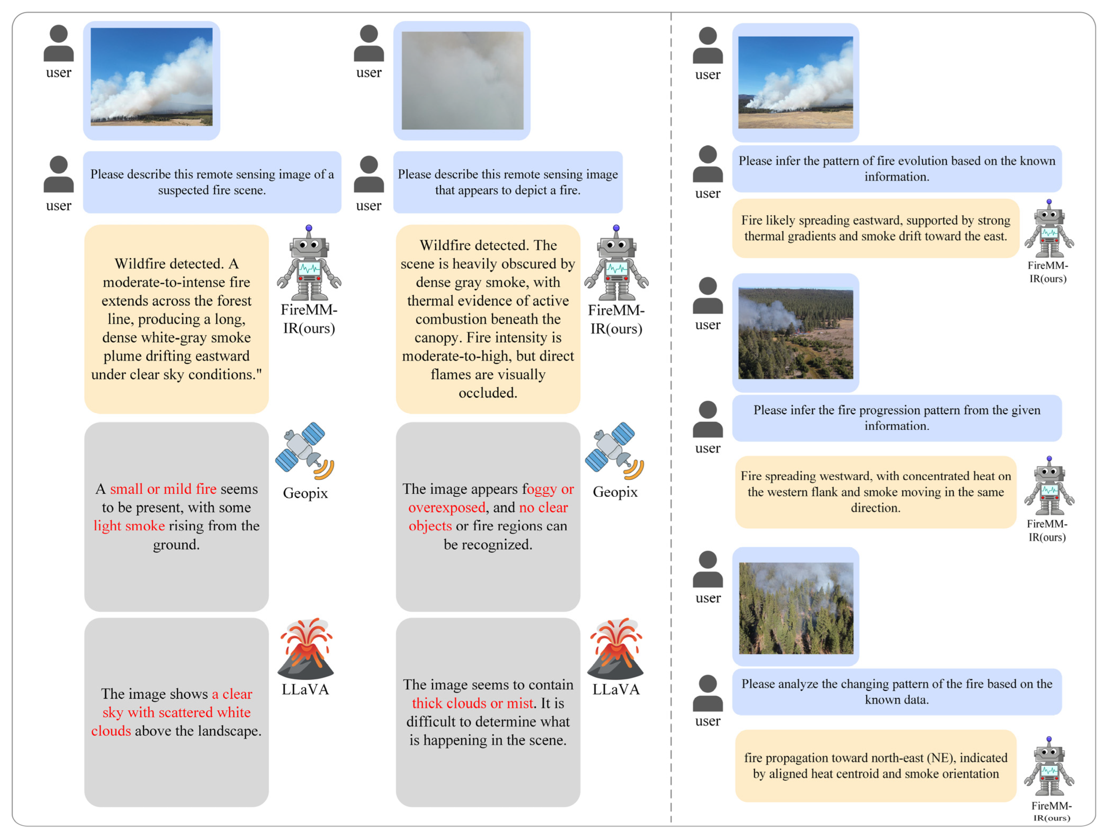- First remote sensing multi-modal large language model for forest fire scene understanding: FireMM-IR is the first MLLM specifically designed for remote sensing forest fire imagery, enabling high-level scene understanding that integrates descriptive, analytical, and predictive insights—capabilities that conventional deep learning-based RS fire detection or segmentation models cannot provide.