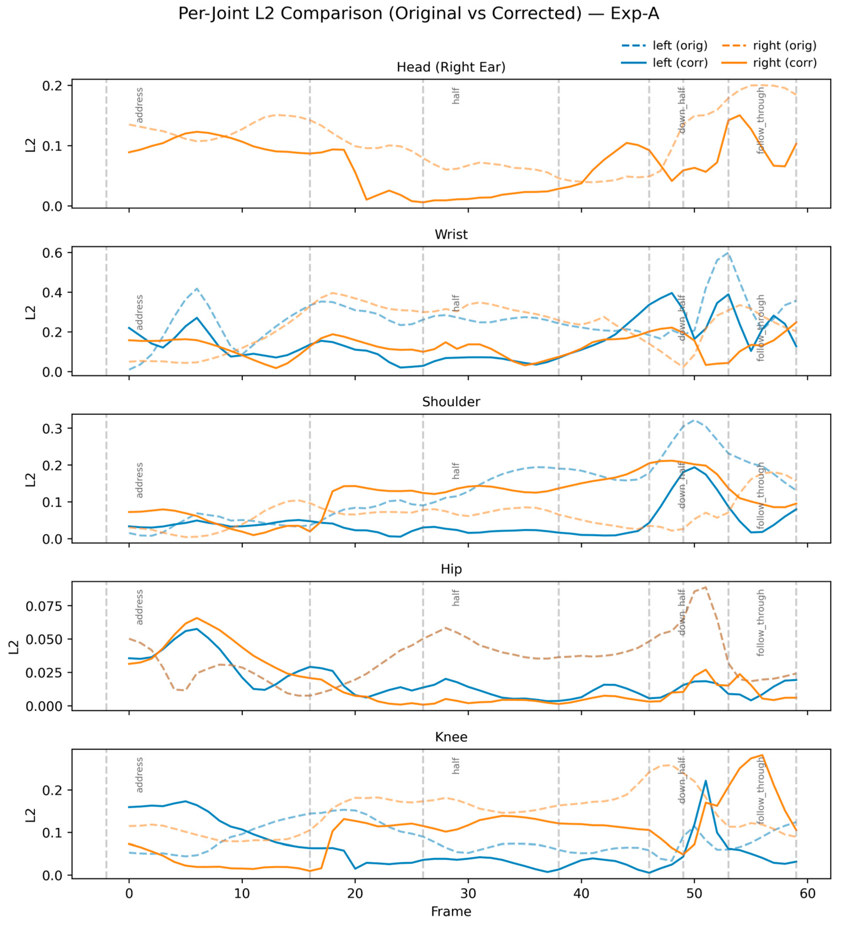Table 2 provides the average L2 error by swing phase across all users. Static correction is most successful during stable phases (address, takeaway), but shows reduced effectiveness during high-speed dynamic segments (top → impact).