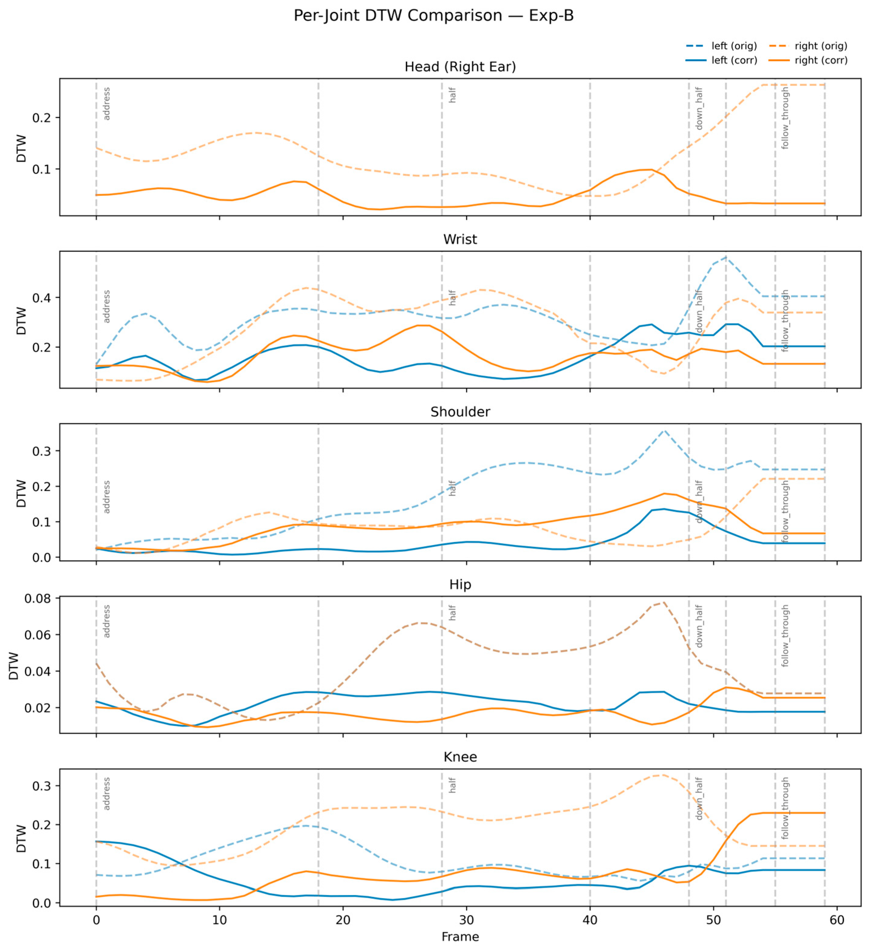 Table 3 shows the Velocity-DTW improvement achieved by Exp-B for User 1. Temporal rhythm alignment improves by 51.27% on average, with the largest gains observed in the wrists and knees—joints most responsible for acceleration and deceleration patterns.