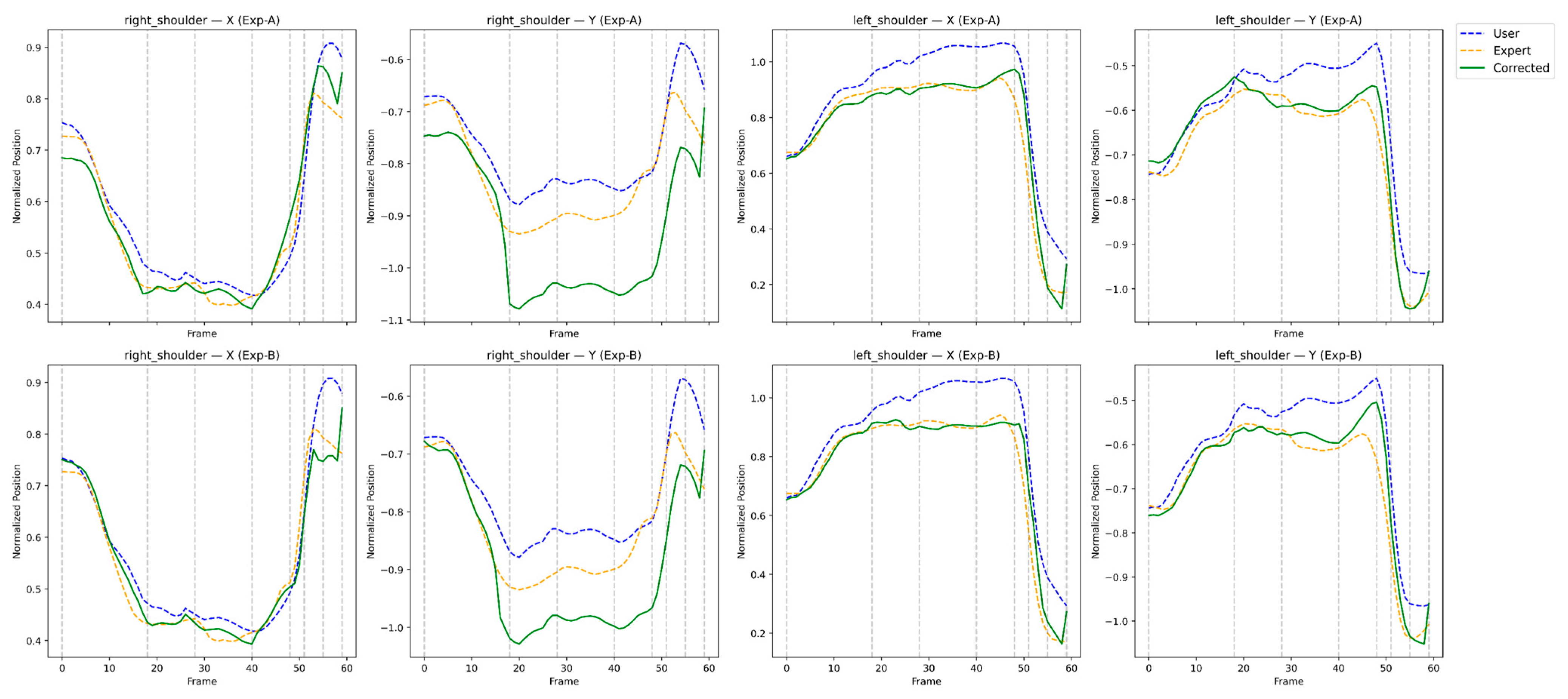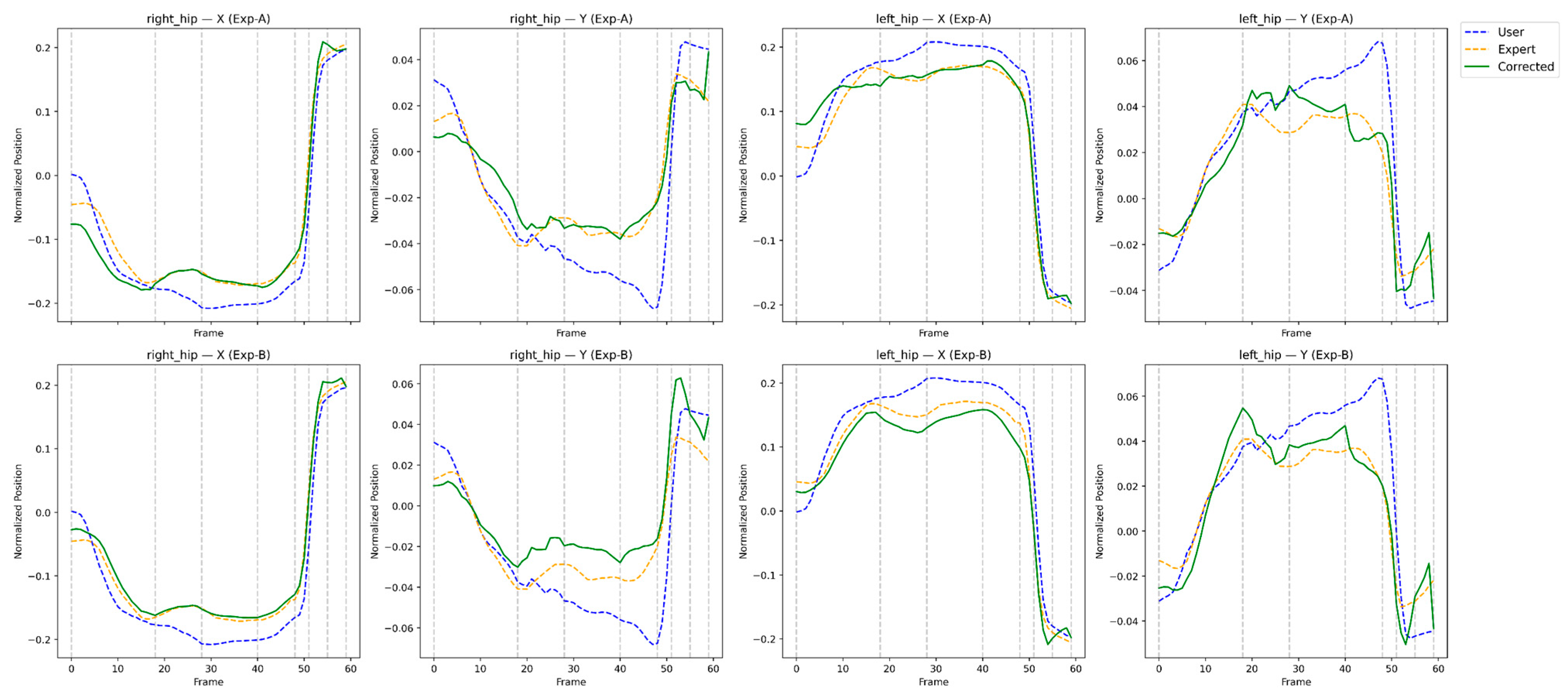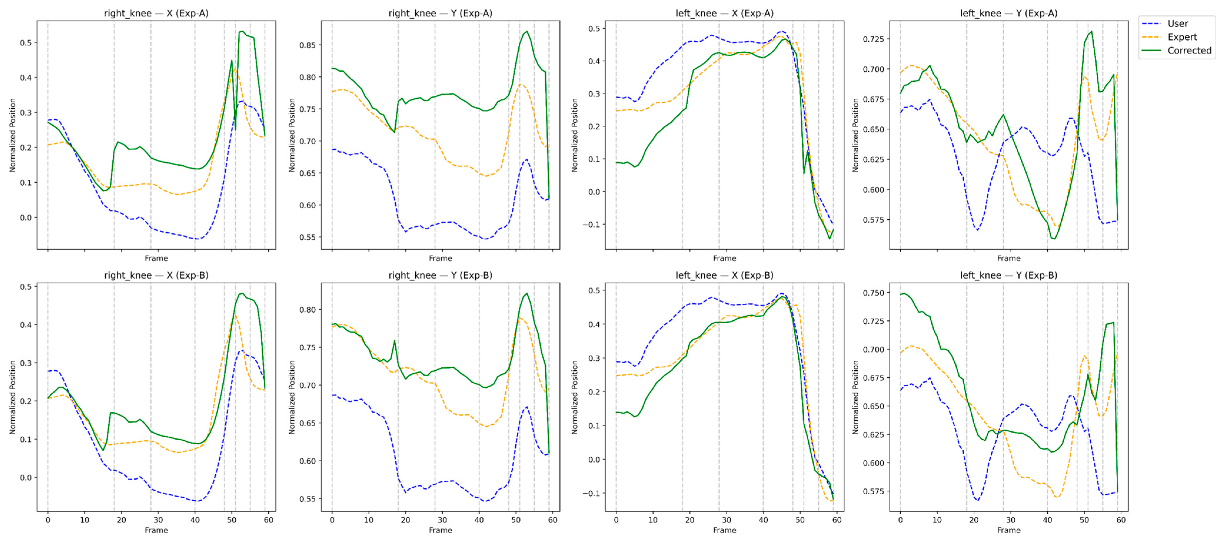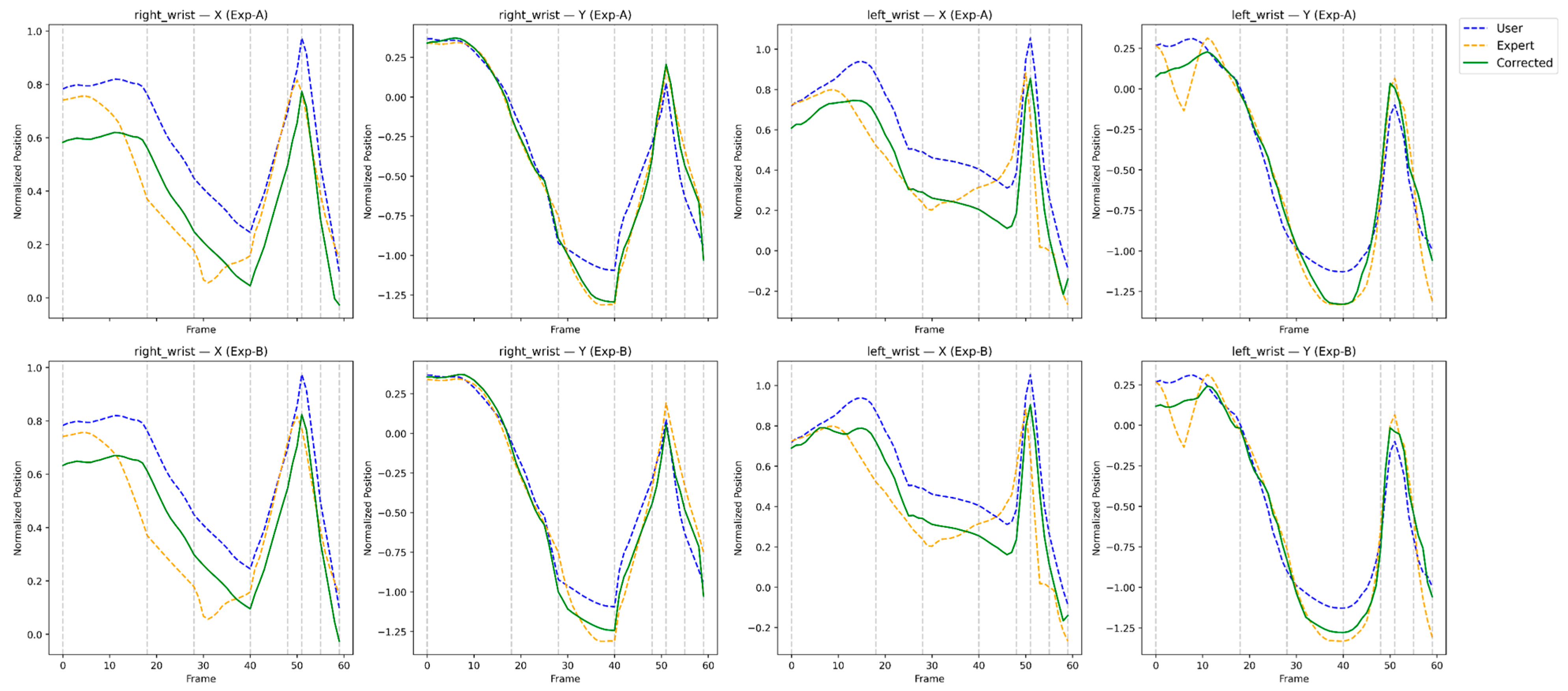 Finally, the corrected swing sequence is reconstructed from the accumulated correction vectors and provided as output. The system supports visualization and quantitative analysis, allowing users to compare original, corrected, and expert swings in terms of joint trajectories, error curves, and temporal alignment. Through this end-to-end pipeline, the proposed framework generates smooth, rhythm-aware swing corrections that progressively guide user motions toward expert-level patterns.