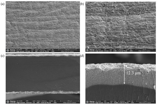 SEM results of IPMC: (a) surface SEM image (×500 magnification); (b) surface SEM image (×2000 magnification); (c) Cross-sectional SEM image; (d) electrode thickness.