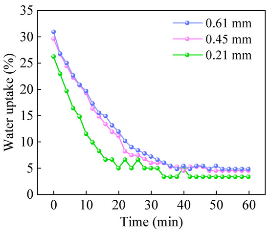 As shown in Figure 3, under ambient conditions, the initial water uptakes of the three IPMC samples with thicknesses of 0.21 mm, 0.45 mm, and 0.61 mm were 26.23%, 29.63%, and 30.95%, respectively. After air exposure for 42 min, 48 min, and 52 min, the water uptakes stabilize at 3.28%, 4.44%, and 4.79%, respectively. The water uptake exhibits an exponential decay trend over time: upon air exposure, the water uptake drops rapidly, then the rate of decline gradually slows, and eventually stabilizes. This behavior corresponds to the diffusion and evaporation of moisture from the interior of the material to the dry ambient air. Thicker IPMC samples show higher initial water uptake, indicating that thicker materials can absorb and retain more water. Furthermore, thicker samples require a longer time to reach a stable water uptake and demonstrate better water-retention capability, which is attributed to the longer diffusion path required for moisture to travel from the interior to the surface. In summary, to ensure that subsequent sensing performance tests are conducted under stable water-content conditions, all IPMC samples must be preconditioned via air exposure for a sufficient duration (60 min) before testing, in order to eliminate the interference caused by variations in water uptake on the sensing voltage signal output.