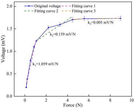 As shown in Figure 4, the sensing performance curve of the IPMC sensor can be divided into three distinct regions: S1 (0~1.08 N), S2 (1.08~4.46 N), and S3 (4.46~8.97 N). The corresponding sensitivities were k1 = 1.059 mV/N, k2 = 0.159 mV/N, and k3 = 0.005 mV/N, respectively. Evidently, the sensitivity of the IPMC pressure sensor in the low-pressure range (Region S1) is significantly higher than that in the medium- and high-pressure ranges (Regions S2 and S3). This characteristic indicates that the IPMC sensor is particularly suitable for micro-force measurement in practical applications.