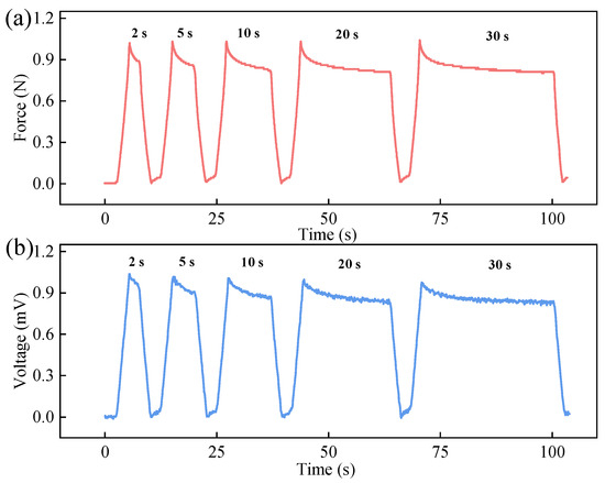 The tensile testing machine was used to apply fixed pressures with varying holding times (2 s, 5 s, 10 s, 20 s, and 30 s) to the IPMC at a constant loading speed, characterizing its sensing voltage response under static loading. The results are presented in Figure 5.