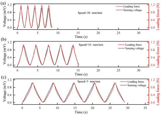 To assess the real-time tracking capability, the output voltage was compared with the dynamically applied loading force at rates of 5, 10, and 20 mm/min. The results are shown in Figure 6. As can be seen from Figure 6, under all three loading speeds, the IPMC generates corresponding sensing voltages in response to pressure changes, and both the sensing voltage curve and the loading force curve exhibit a sinusoidal-like variation. The shapes of the loading force and the sensing voltage are highly similar, and the repeated test curves show good overlap, indicating excellent morphological synchronization. The strong synchronization of the IPMC material ensures consistency and reliability in its output signal, which facilitates relatively accurate and stable dynamic force sensing and decoupling in practical applications.