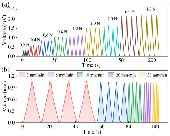 This section investigates the sensing voltage response of the IPMC sensing material under different loading forces and loading speeds to further evaluate its performance in practical applications. For the pressure tests, the force applied by the universal tensile testing machine was set from 0.2 N to 8 N. For the loading speed tests, a constant force of 1 N was maintained while the loading speed was varied at 2 mm/min, 5 mm/min, 10 mm/min, 20 mm/min, and 30 mm/min. Each parameter was tested for four repeated cycles. The corresponding results are presented in Figure 8.