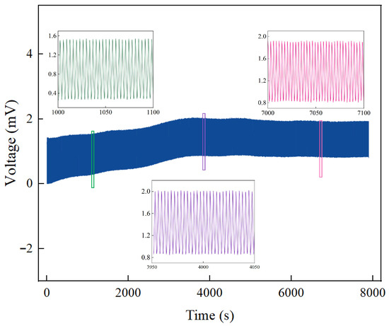 As observed in Figure 9, the IPMC sensor generated consistent and repeatable voltage signals throughout the prolonged loading–unloading test. Although a gradual decrease in the signal amplitude was observed under stable ambient laboratory conditions (~25 °C, 40–60% RH)—from approximately 1.23 mV at 1000 s to about 1.15 mV at 4000 s and 1.09 mV at 7000 s, representing an overall attenuation of 11.3%—the waveform itself remained well-defined without significant distortion or failure. This indicates that the sensor maintains good signal stability and repeatability over extended cyclic operation within this specific environmental range.
