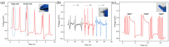 Mouse Click Pattern Recognition test: To leverage its flexibility and high sensitivity for human–computer interaction, the IPMC sensor was attached to the tester’s right index finger. In the mouse click pattern recognition test experiment, the IPMC sensing material was attached to the index finger of the tester’s right hand. The tester performed consecutive single- and double-click actions on a mouse. As shown in Figure 10a, a single click produced a voltage signal with one peak, while a double click yielded two distinct peaks. This clear distinction enables reliable recognition of basic click patterns, highlighting the sensor’s potential for intuitive control of flexible/wearable devices.