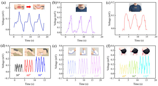 To further verify the application potential of the IPMC sensing material in human motion behavior analysis, the IPMC sensor was fixed to different test sites on the human body (face, throat, chest, finger joints, elbow joints, and knee joints) with medical tape. The signal acquisition was conducted in a laboratory environment at room temperature, and the test results are presented in Figure 11.