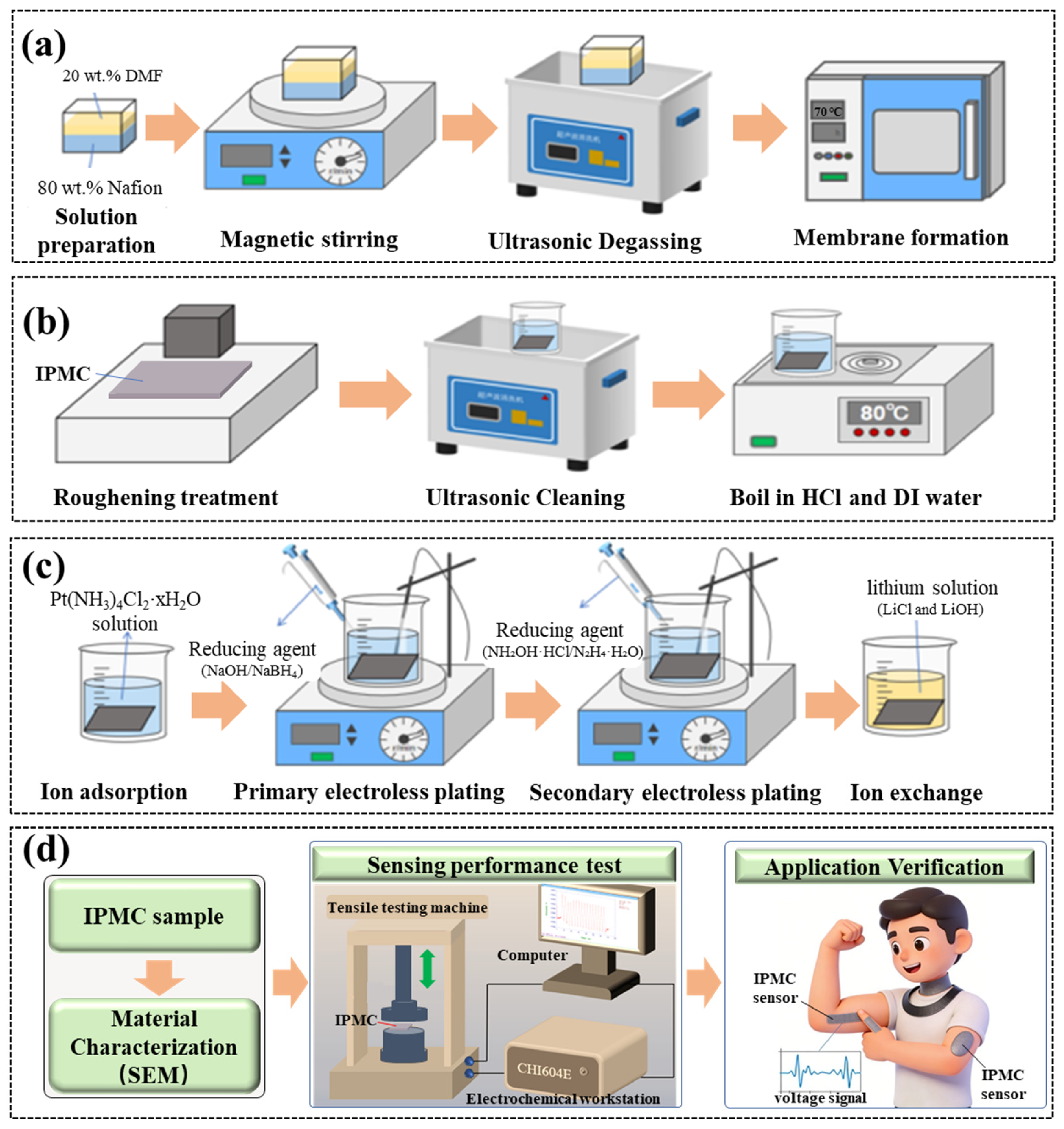 To facilitate the deposition of platinum particles, the dried Nafion membrane was roughened with an abrasive for 30 min to increase its surface roughness. Subsequently, it is cleaned with deionized water and sonicated for 30 min to remove surface impurities. Finally, it is acid-boiled with dilute hydrochloric acid at 80 °C for 30 min, followed by boiling in water at 80 °C for 30 min, as shown in