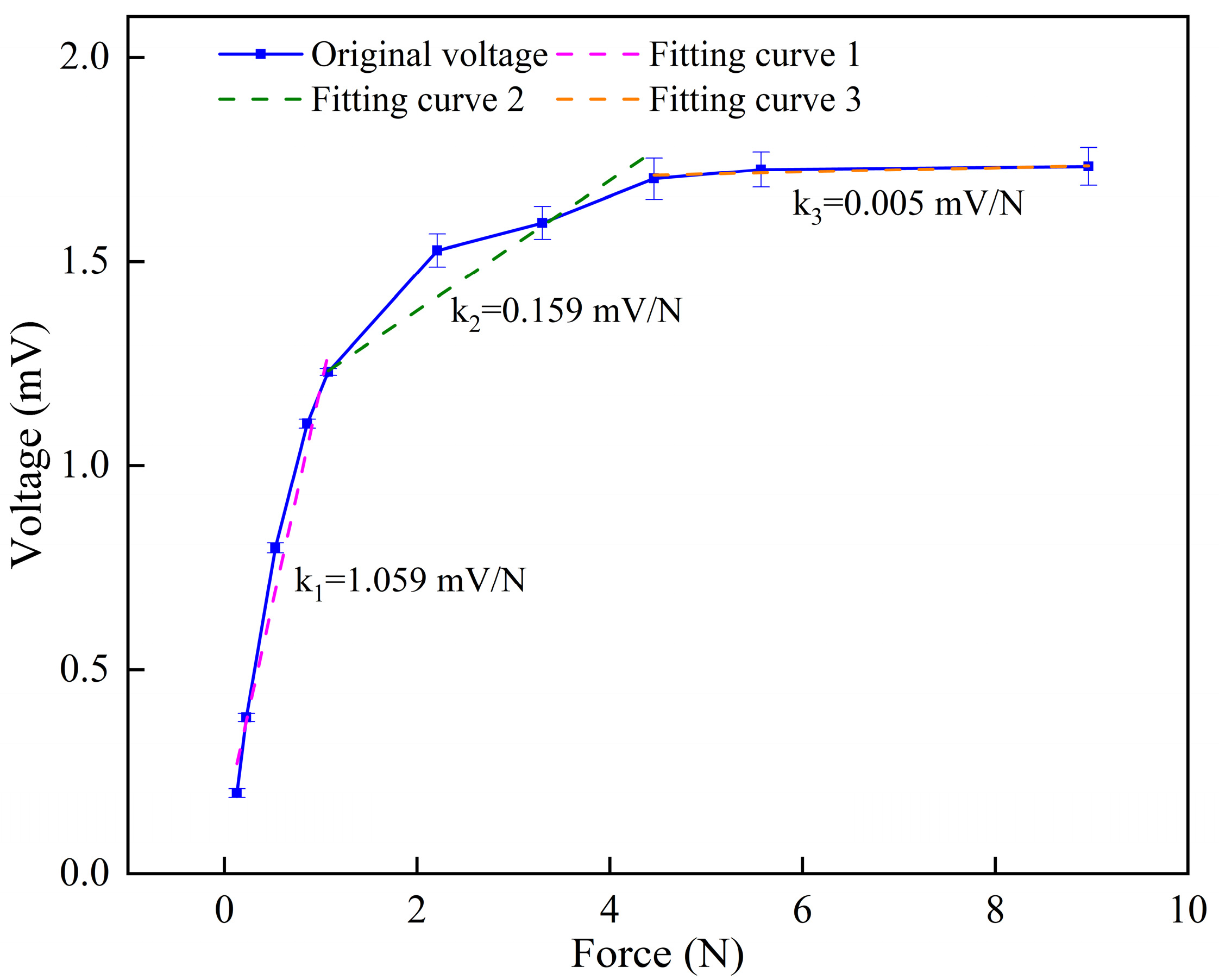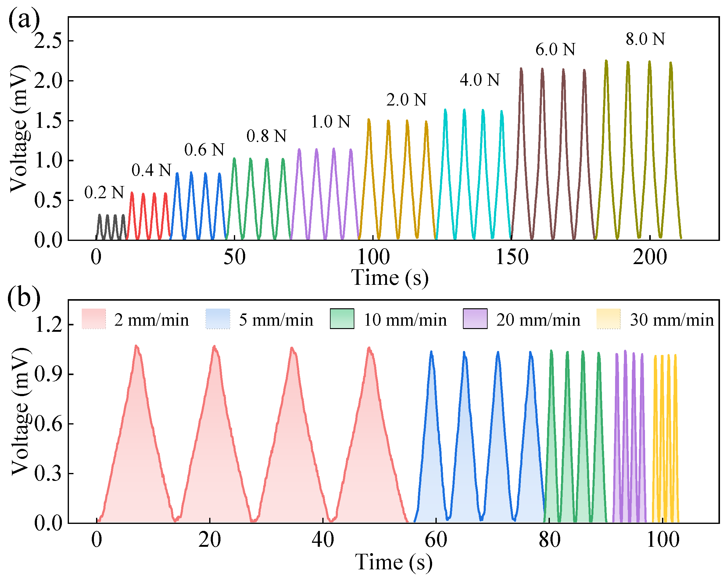This section investigates the sensing voltage response of the IPMC sensing material under different loading forces and loading speeds to further evaluate its performance in practical applications. For the pressure tests, the force applied by the universal tensile testing machine was set from 0.2 N to 8 N. For the loading speed tests, a constant force of 1 N was maintained while the loading speed was varied at 2 mm/min, 5 mm/min, 10 mm/min, 20 mm/min, and 30 mm/min. Each parameter was tested for four repeated cycles. The corresponding results are presented in