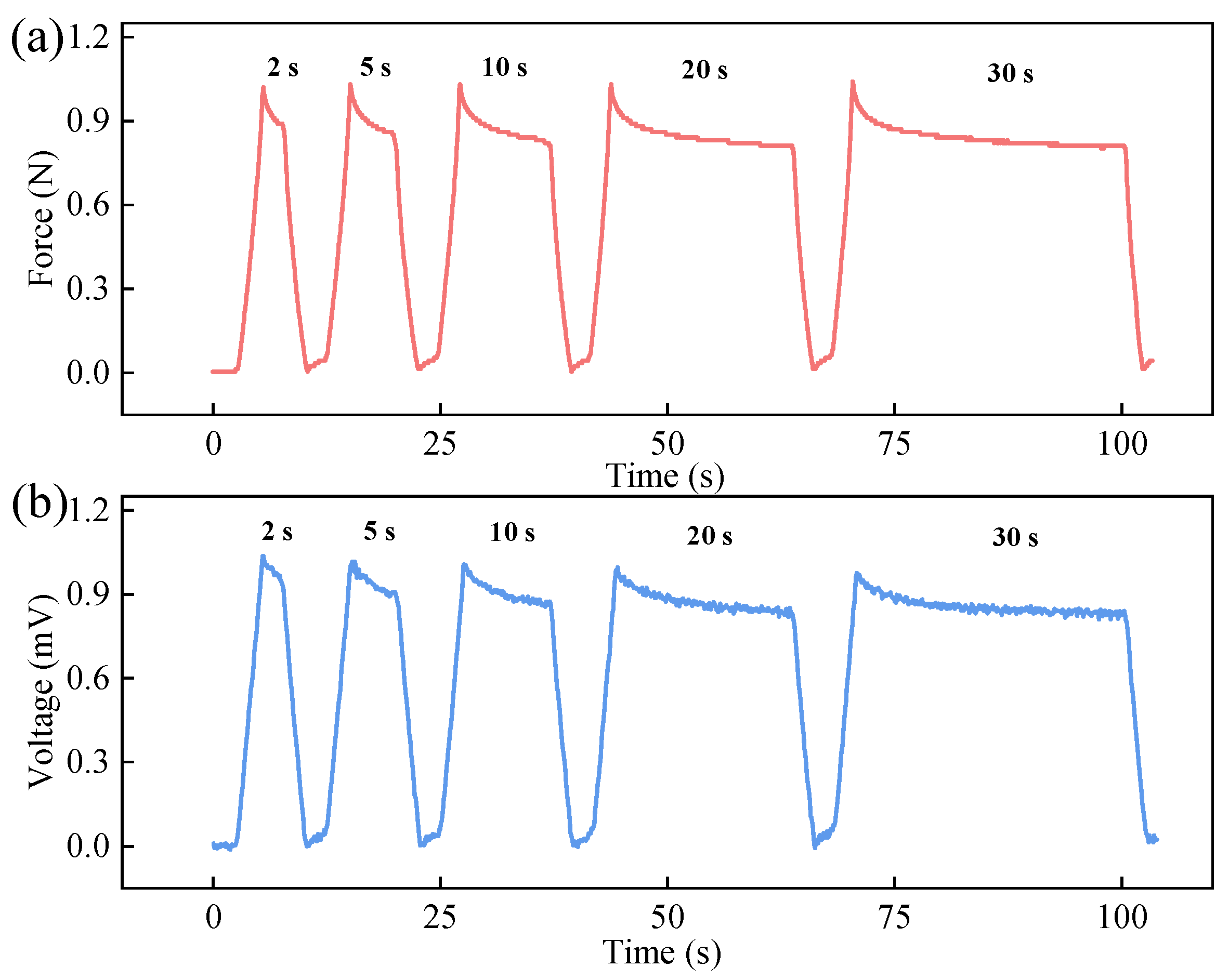 Moreover, the voltage curves (both waveform and peak values) from the four repeated tests exhibit good consistency, preliminarily indicating that the IPMC has good response consistency and test repeatability under the given conditions. In summary, the prepared IPMC sensor can not only sense the “magnitude of force” but also distinguish the “rate of force change”, demonstrating its capability for dynamic multi-parameter pressure sensing.