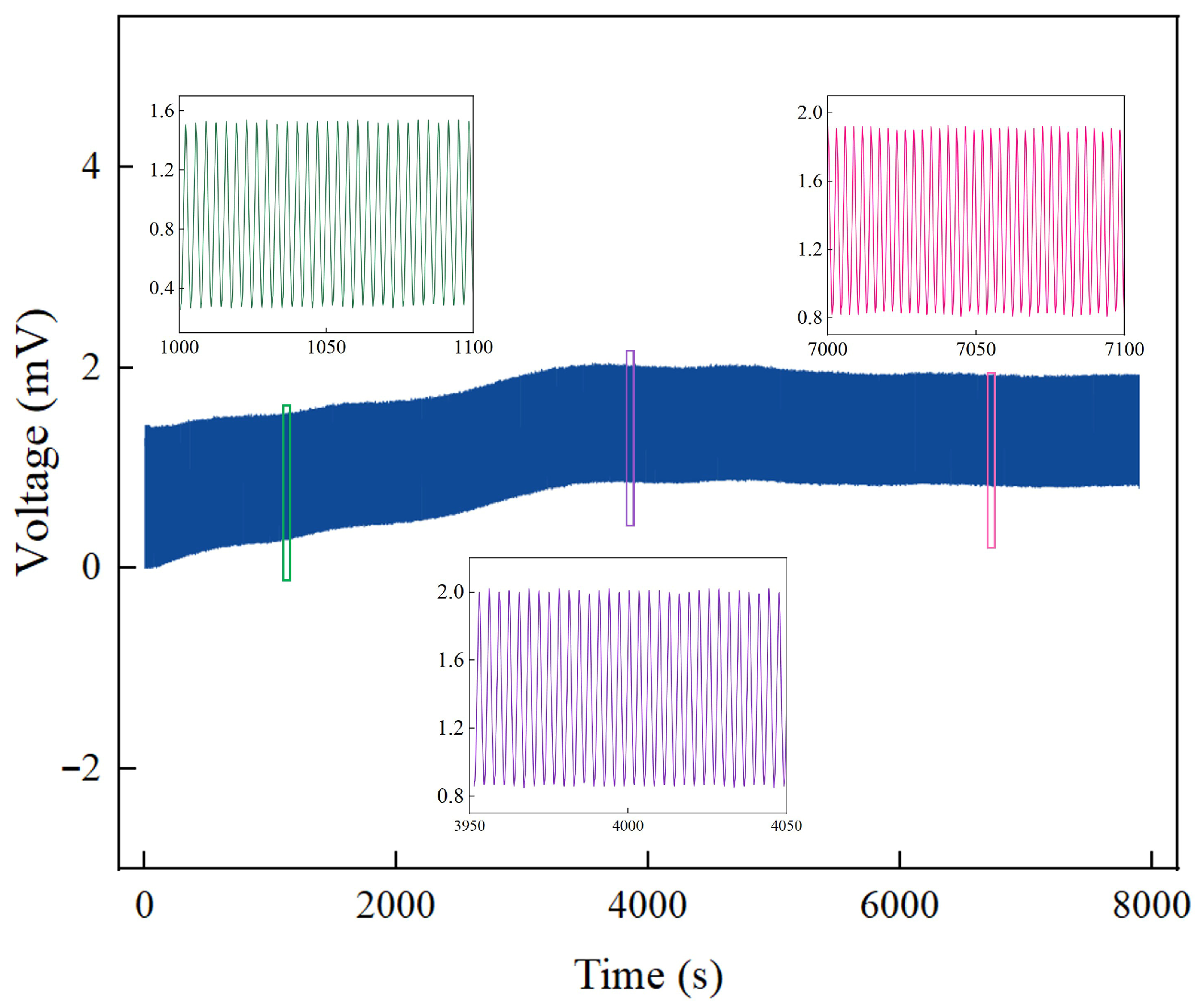 Figure 9, the IPMC sensor generated consistent and repeatable voltage signals throughout the prolonged loading–unloading test. Although a gradual decrease in the signal amplitude was observed under stable ambient laboratory conditions (~25 °C, 40–60% RH)—from approximately 1.23 mV at 1000 s to about 1.15 mV at 4000 s and 1.09 mV at 7000 s, representing an overall attenuation of 11.3%—the waveform itself remained well-defined without significant distortion or failure. This indicates that the sensor maintains good signal stability and repeatability over extended cyclic operation within this specific environmental range.