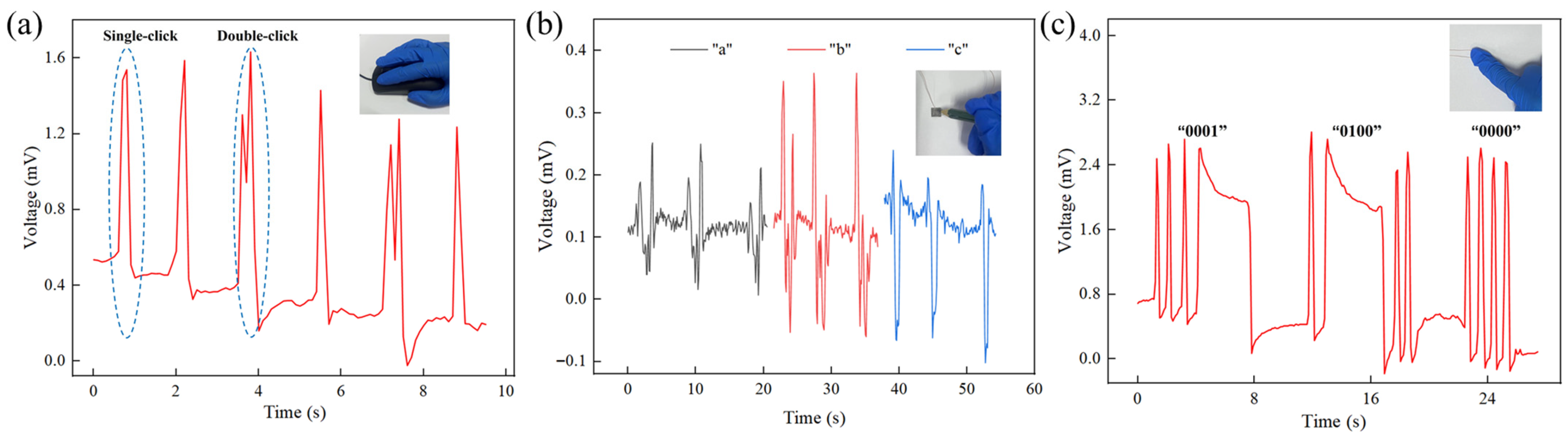 Figure 10a, a single click produced a voltage signal with one peak, while a double click yielded two distinct peaks. This clear distinction enables reliable recognition of basic click patterns, highlighting the sensor’s potential for intuitive control of flexible/wearable devices.