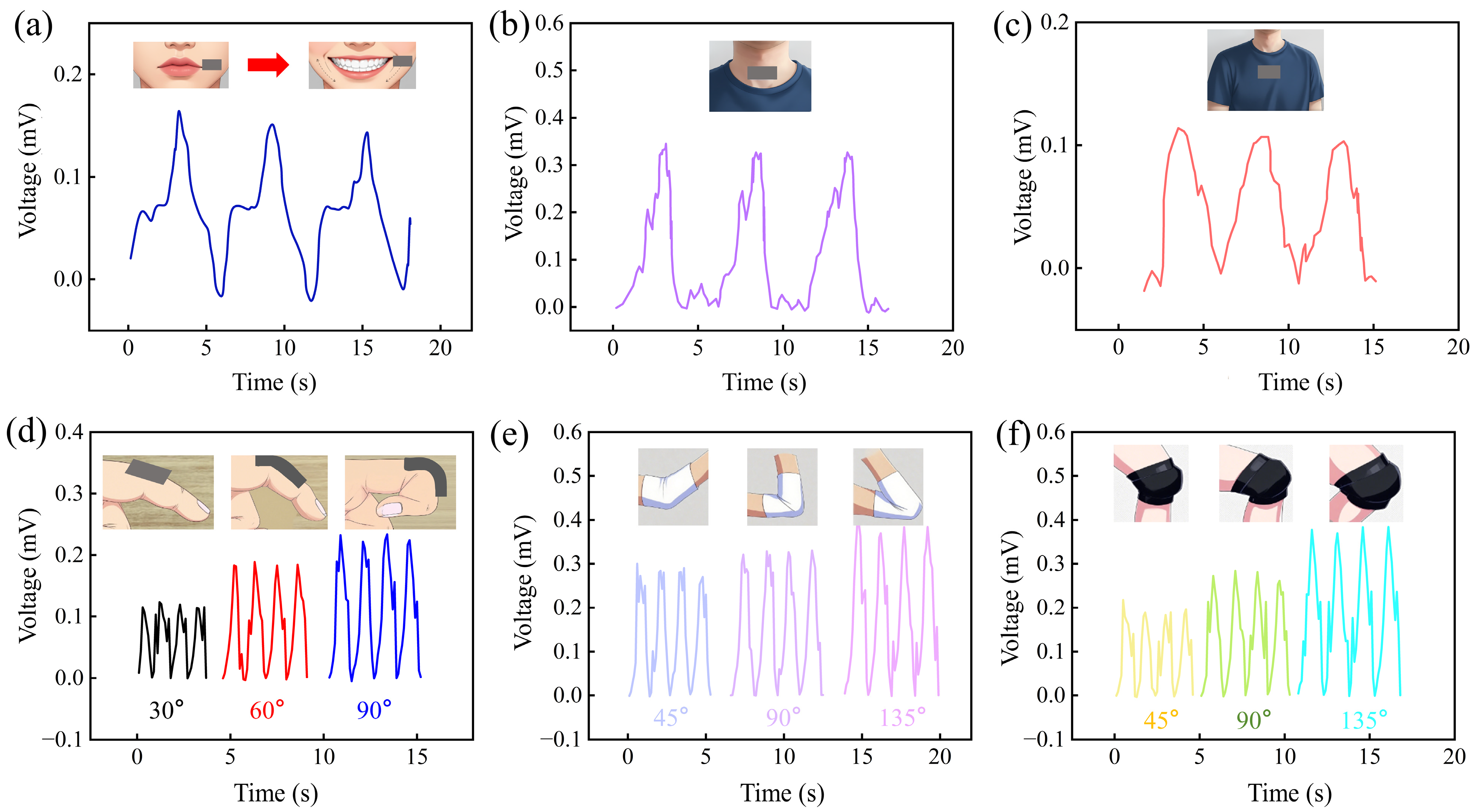 Figure 11b,c, the sensor detected distinct signals corresponding to swallowing and deep breathing, respectively. Both generated clear, cyclical responses. Notably, the voltage amplitude for swallowing was significantly higher than for breathing. This is primarily because the rapid, large-amplitude movement of the laryngeal cartilages during swallowing imposes a strong, abrupt dynamic strain (high strain rate and amplitude) on the sensor. In contrast, the gentle thoracic movement during deep breathing results in weaker, slower strain. Consequently, the swallowing signal appears as a sharp voltage pulse, while the breathing signal is smoother (