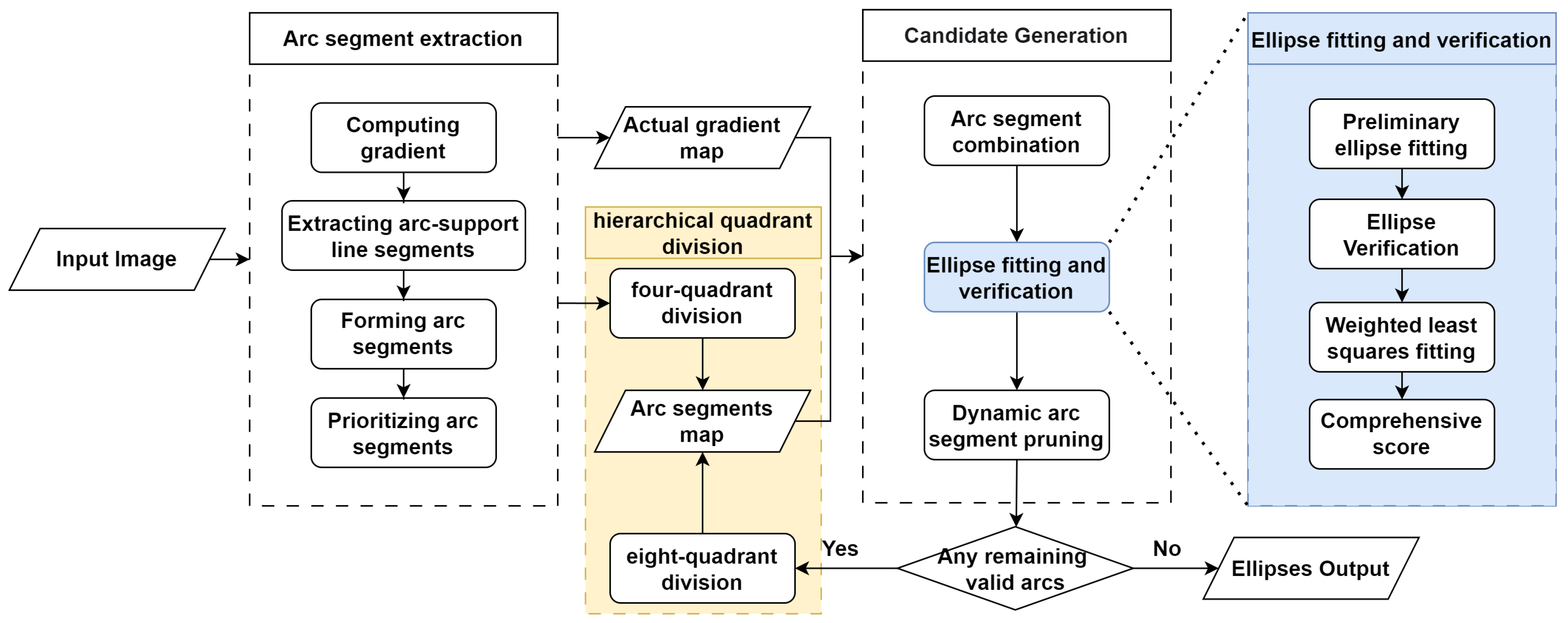 Unlike methods based on Hough Transform, our algorithm significantly reduces the candidate combinations by employing a hierarchical quadrant division strategy and dynamic arc segment pruning. These mechanisms prioritize high-quality arc segments and iteratively remove redundancies, ensuring real-time performance.