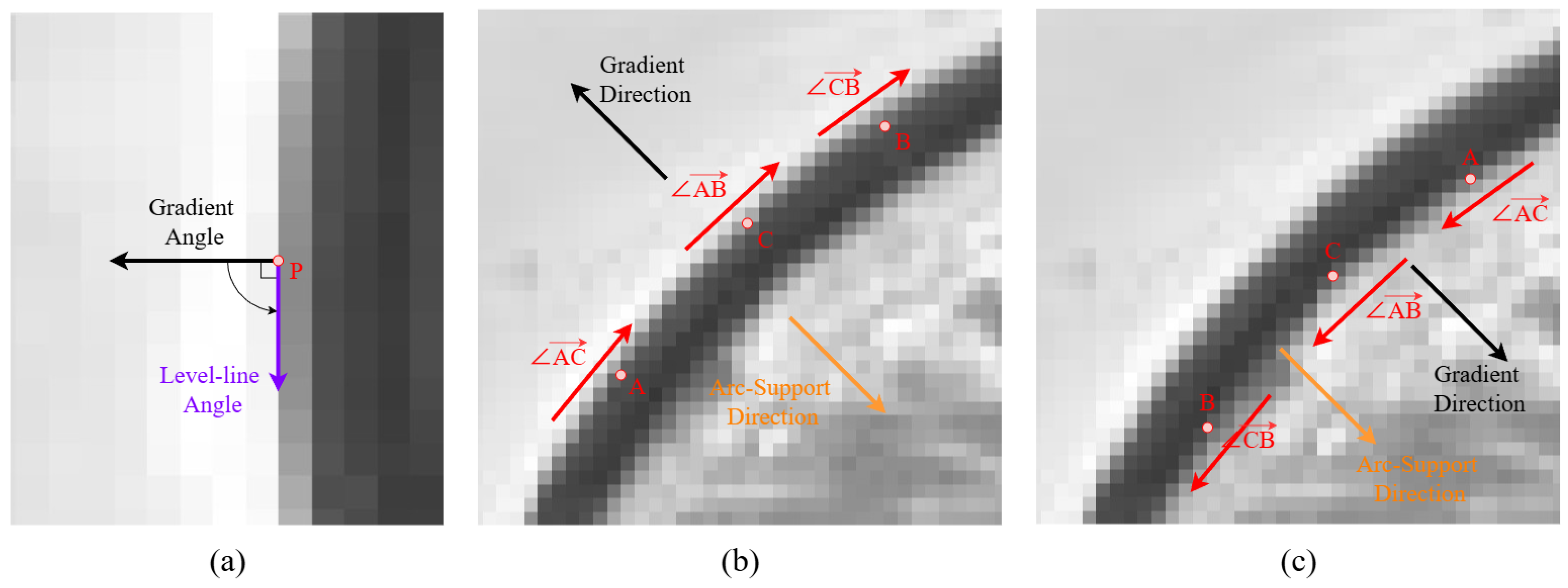 clockwise from the gradient direction). When the level-line angles within a segment’s region exhibit monotonic variation with the same rotation direction, it is labeled as an arc-support segment. Positive or negative polarity is assigned based on whether the rotation direction aligns with the gradient direction, as shown in