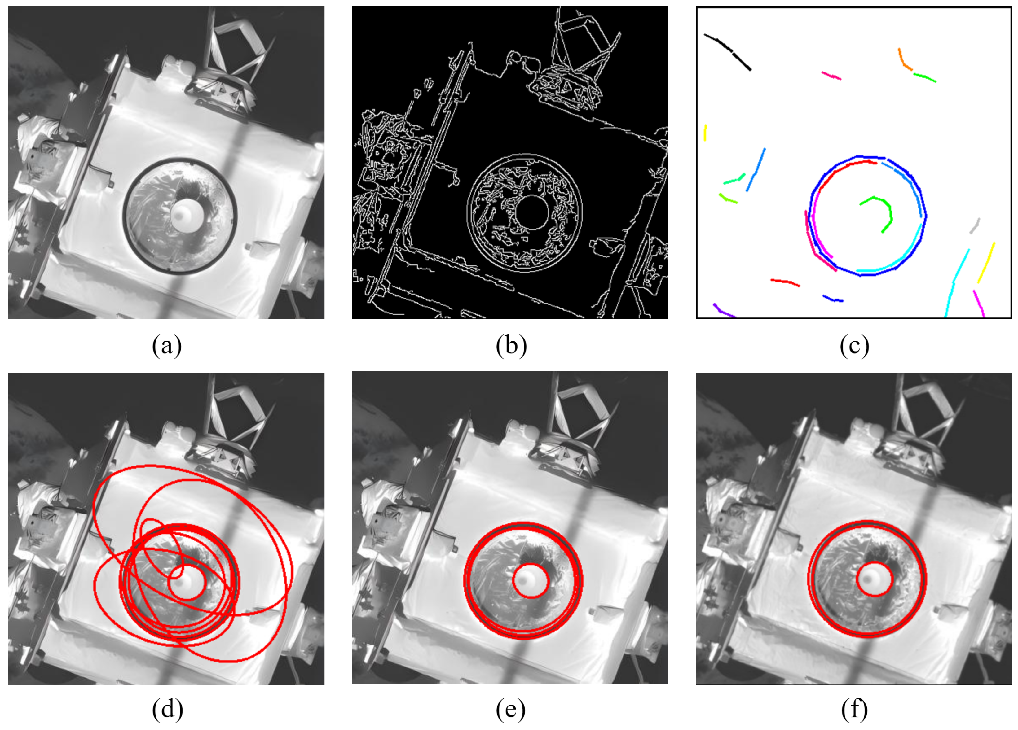12] of non-cooperative satellites, demonstrating the critical role of precise feature extraction. Therefore, the high-precision detection of ellipse targets directly impacts the accuracy and robustness of pose estimation. However, in complex scenarios such as when the docking ring is obscured by shadows from robotic arms or nozzles, the high-precision extraction of ellipse features faces many challenges, including severe contour loss, interference from redundant arc segments, and rapidly changing shadows. Therefore, developing an efficient and robust ellipse detection method is particularly important.
