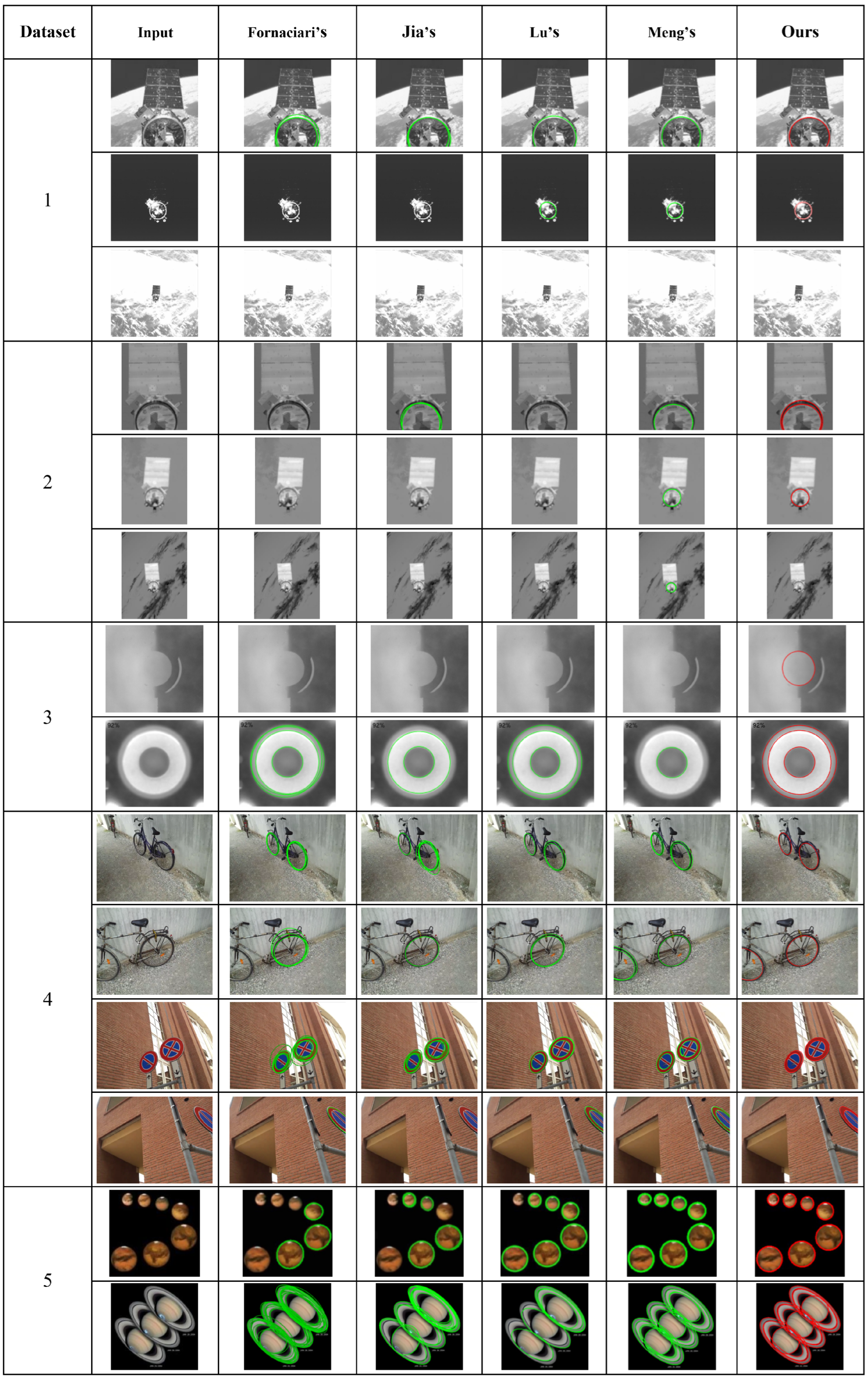 Table 2. Our algorithm achieves the highest accuracy through weighted least squares ellipse fitting and strictly screens the correct ellipses using a score. Therefore, our algorithm has a higher recall rate and F-measure than the Fornaciari, Jia, and Lu methods, achieving significant performance improvements. However, in the satellite dataset and Prasad dataset, the recall rate is not higher than that of the Meng algorithm, and the F-measure is not the best. The main reason is that when the pixel size of the ellipse is small in these datasets, it is difficult to generate enough arc segments for fitting the ellipse, and our algorithm detects fewer ellipses. Examples of ellipse detection in the five datasets are shown in
