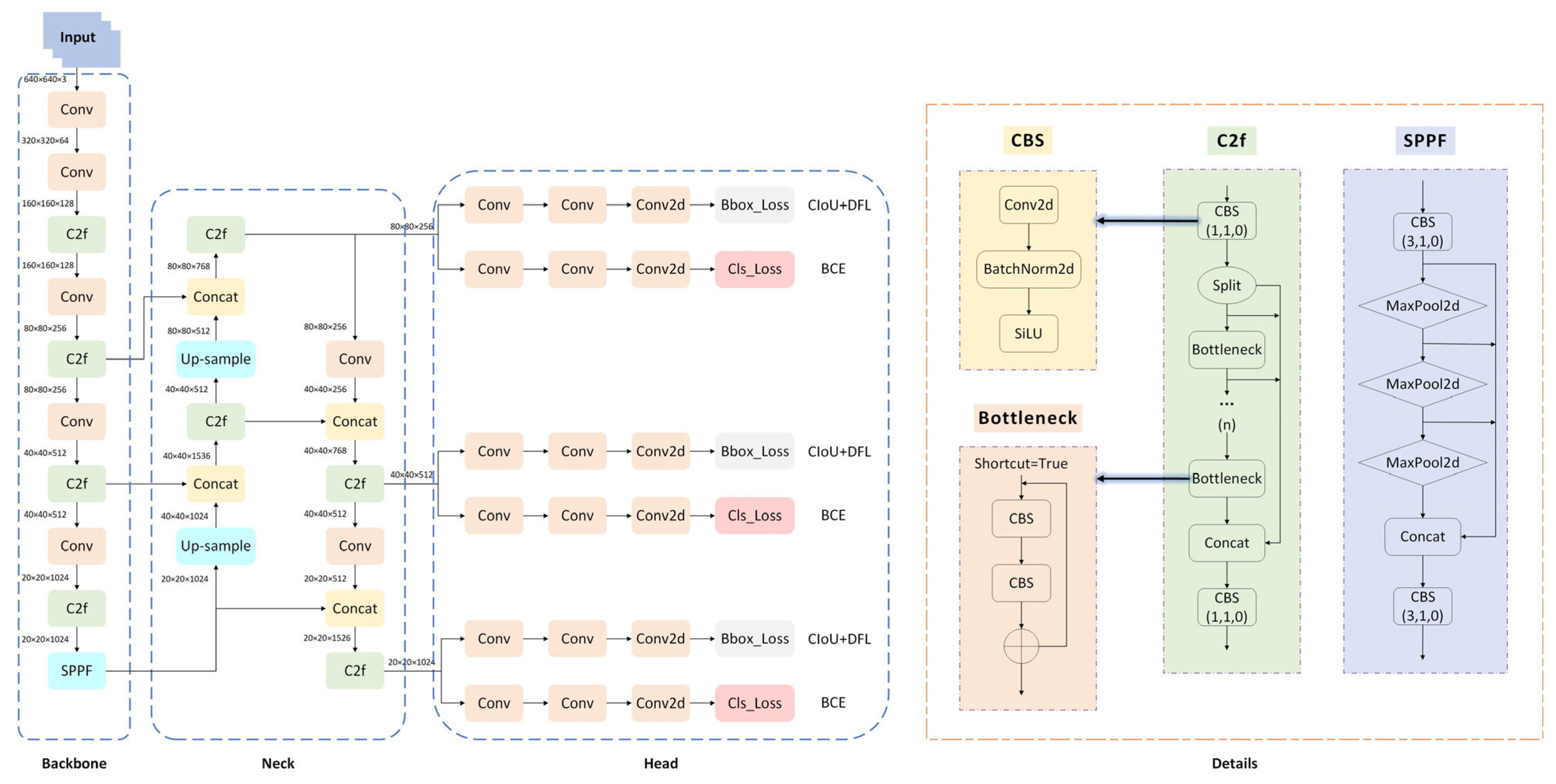 29], released by Ultralytics in 2023, offers five different-scale versions—N, S, M, L, X—based on network depth, width, and maximum channel count, enabling adaptation to various deployment platforms and scenarios. Among these, YOLOv8n features the fewest parameters and minimal floating-point operations, delivering high efficiency ideal for real-time deployment while maintaining strong accuracy. Consequently, this paper adopts YOLOv8n as the baseline model, whose network architecture and key components are illustrated in