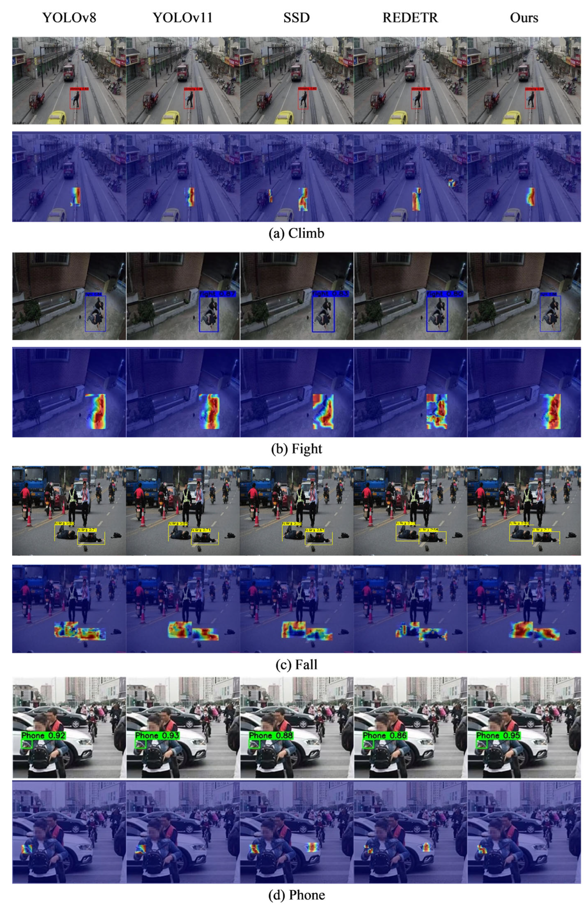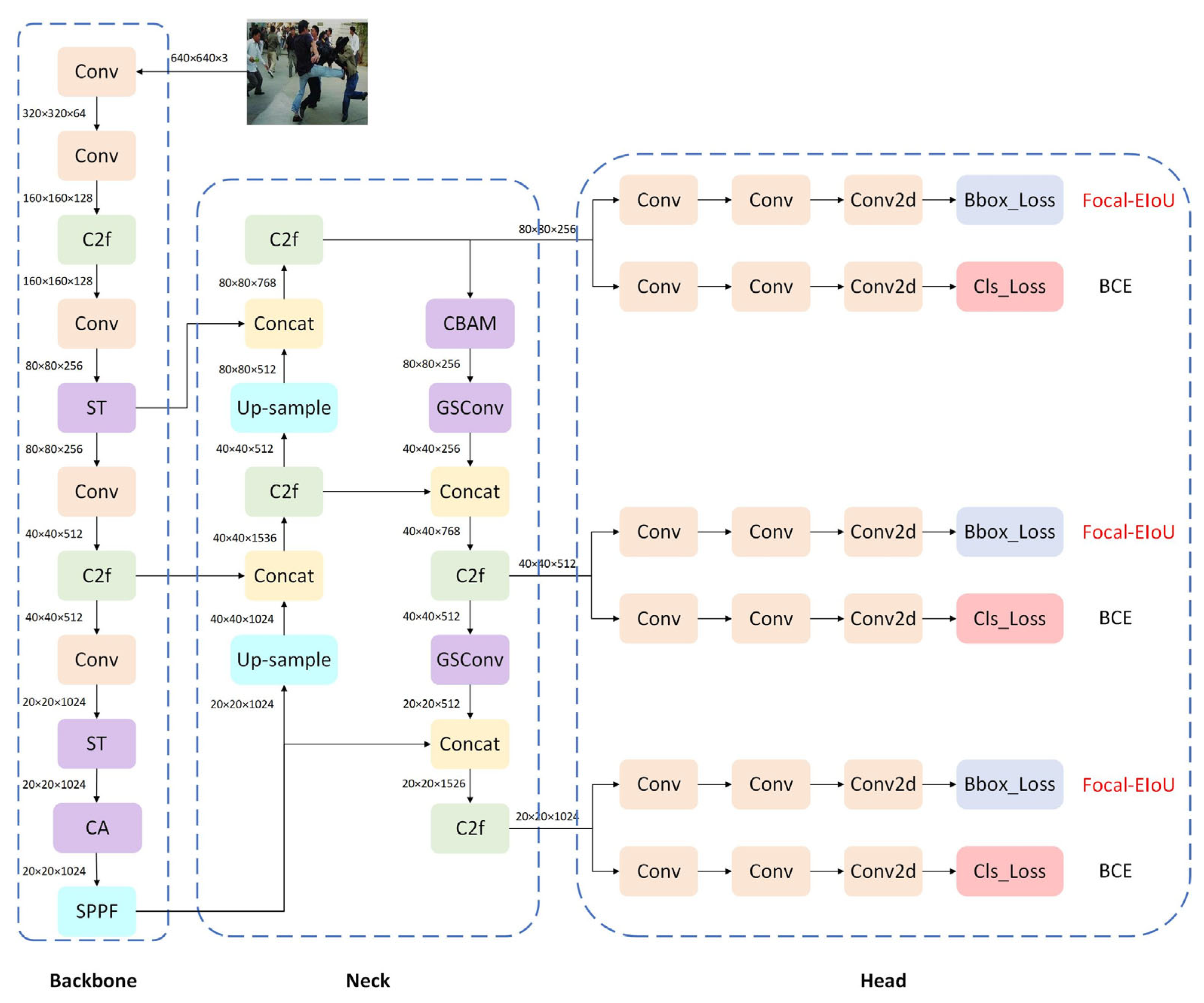In response to this characteristic, this paper embeds the CA into the backbone of YOLOv8. This allows the network to focus more on target-related regions and channel features within images, enabling it to capture key features of abnormal behavior more accurately while suppressing interference from irrelevant background information. Simultaneously, it enables the subsequent Neck and Head components to perform object bounding box regression and category prediction based on more precise features. This significantly improves the accuracy of target location detection, particularly for multi-object detection in complex scenes.