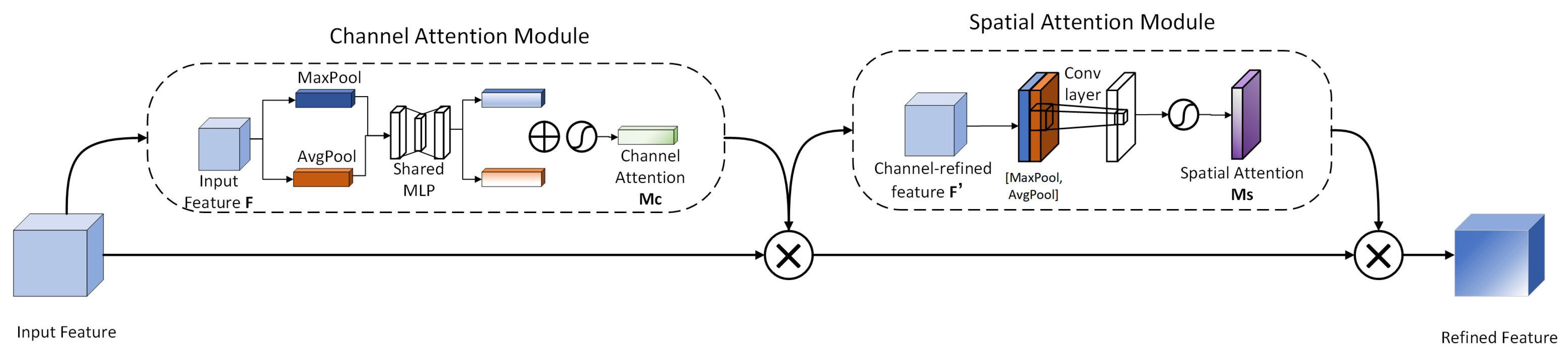 33] is a representative lightweight attention mechanism. Its core philosophy lies in integrating two major branches: Channel Attention and Spatial Attention. The module’s significant advantage lies in its ability to effectively enhance a convolutional neural network’s capability to capture and utilize key features, thereby improving the model’s feature extraction performance, with minimal increase in overall computational complexity and parameter count. The specific structure and workflow are illustrated in