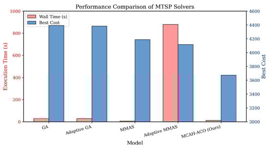 Performance comparison among MTSP solvers. For each algorithm, the light red bar shows wall time in seconds (left axis), while the blue bar displays the best cost achieved (right axis). Lower cost values indicate better optimization performance.