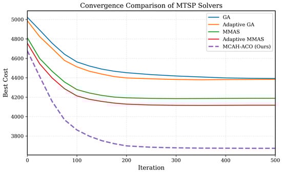 As shown in Table 2 and Figure 2, MCAH-ACO achieves the lowest cost of 3672.94, representing a 12.3% improvement over MMAS and 16.4% over the GA baseline. Notably, computational efficiency is maintained as MCAH-ACO requires only 12.83 s, compared with 879 s for Adaptive MMAS—a 68× speedup while achieving better solution quality. The multi-criteria pheromone decomposition enables effective exploration of the multi-dimensional objective space without the overhead of explicit Pareto dominance calculations, while the 2-opt local search provides significant solution refinement with minimal computational overhead through probability-controlled application.
