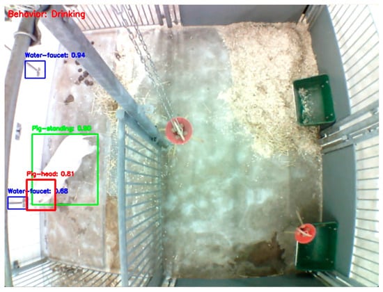 False positive events occur when the pig searches/sniffs next to the drinking faucets as a behavioral habit, which causes the bounding boxes between the pig’s head and the drinking faucets to overlap. An example can be seen in Appendix A. These events do not represent a true drinking event, which is why the arbitrary limit of a minimum of 5 s was set for practical use. False negative results occur when the human observer registers a drinking event in a frame where the pig looked away for a short period. The false positive and negative results only represent 0.8% and 0.1% of frames analyzed, which has no effect on later practical implementation.