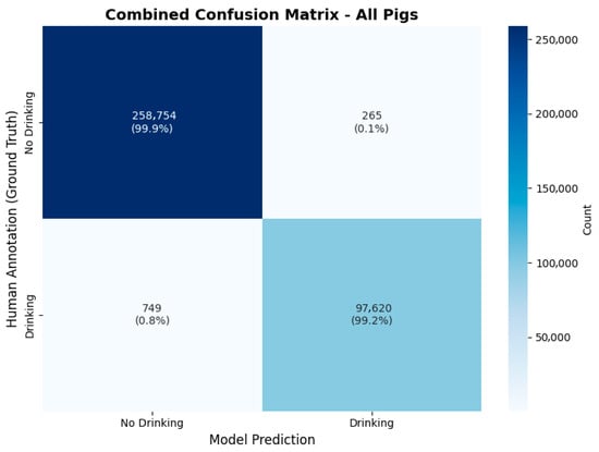 As described in Section 2.6, 72 h of video material was validated to ensure model performance. The following confusion matrix (Figure 7) shows the validation results.
