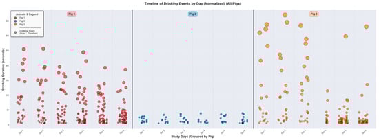 Figure 9 provides a timeline of individual drinking events to highlight the unique behavioral signatures of the three pigs. Clear inter-pig variation is evident. The pattern for Pig 1 (red markers) is characterized by frequent visits to the water source, with durations ranging from brief events to prolonged sessions exceeding 250 s. Pig 3 (orange markers) shows similarly frequent drinking behavior with durations typically ranging from brief to moderate sessions up to approximately 350 s. Conversely, Pig 2 (blue markers) demonstrates a more conservative drinking pattern, with fewer visits and a much narrower, more consistent range of event durations, rarely exceeding 30 s.