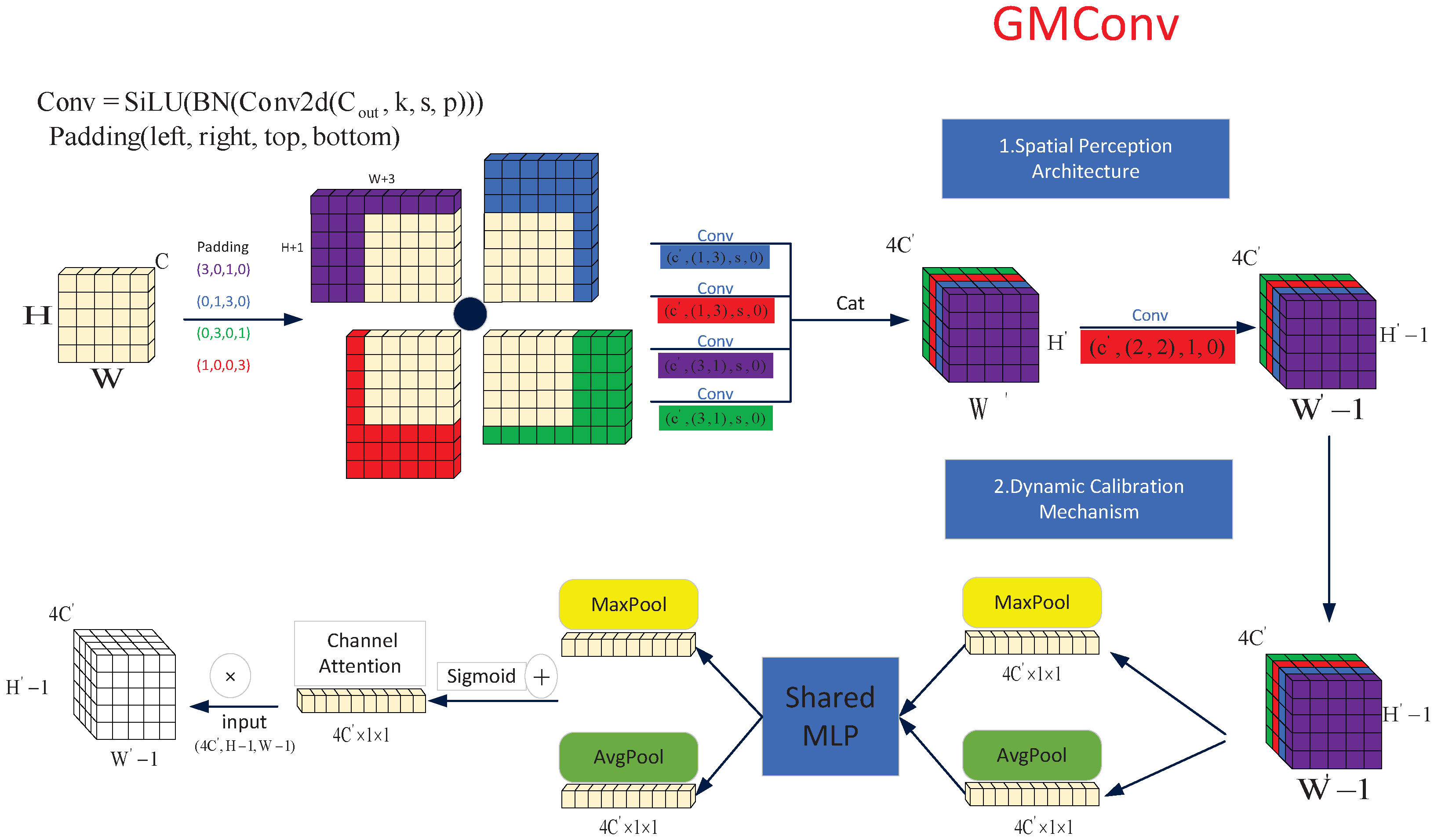 - Gaussian-Matched Convolution (GMConv): The GMConv module is designed based on the Gaussian energy distribution characteristics analyzed in Section 2.2. Unlike conventional convolutions with uniform receptive fields, GMConv employs a synergistic mechanism of multi-directional heterogeneous sampling and dynamic channel calibration. This design precisely models the spatial energy decay of the target (i.e., dense center and sparse periphery), thereby adaptively enhancing target responses across channels while effectively suppressing background noise.