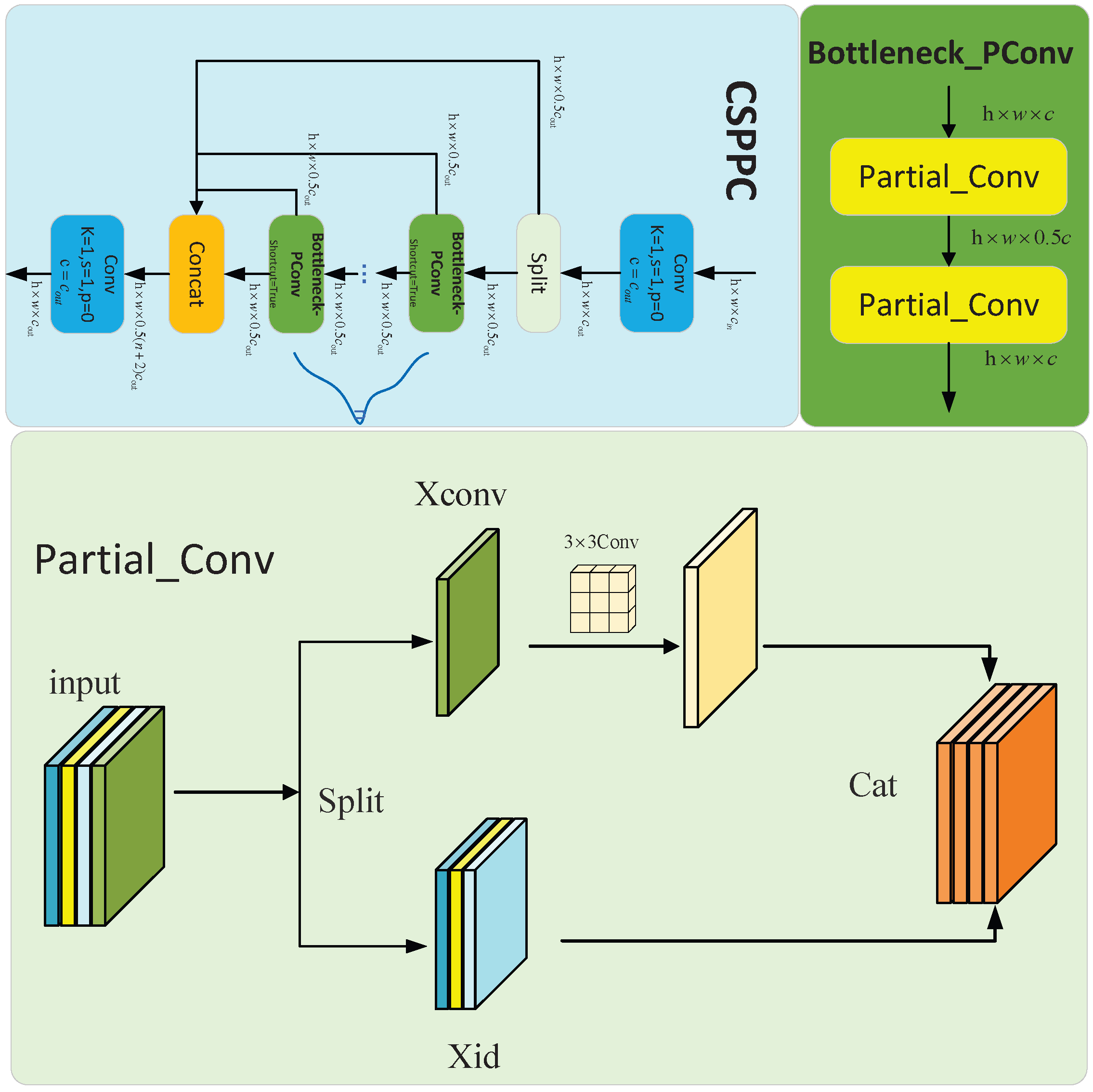- Cross-Stage Partial Pyramid Convolution (CSPPC): In order to achieve model lightweighting, this paper introduces partial convolution (Partial Conv) mechanisms and a pyramid structure into the neck network, constructing the CSPPC module. This design effectively reduces model parameters and computational complexity while enhancing the network’s multi-scale fusion capabilities.