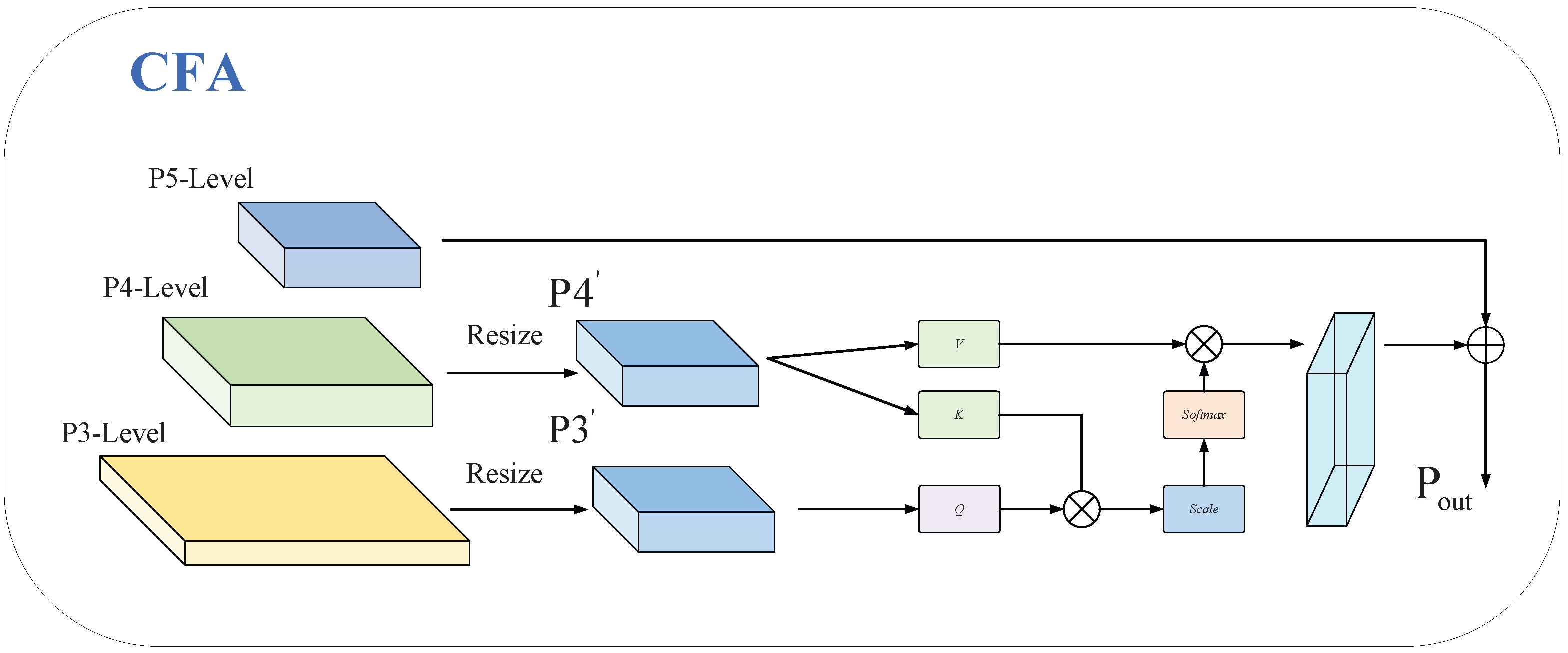 - Cross-Feature Attention (CFA): To enhance fusion efficiency in the multi-scale detection head, the CFA module dynamically integrates shallow high-resolution features (P3) with deep semantic features (P4) using a local attention mask. This mechanism establishes an adaptive balance between fine-grained spatial details and global contextual semantics, resulting in more precise bounding box regression and improved robustness in small-target detection.