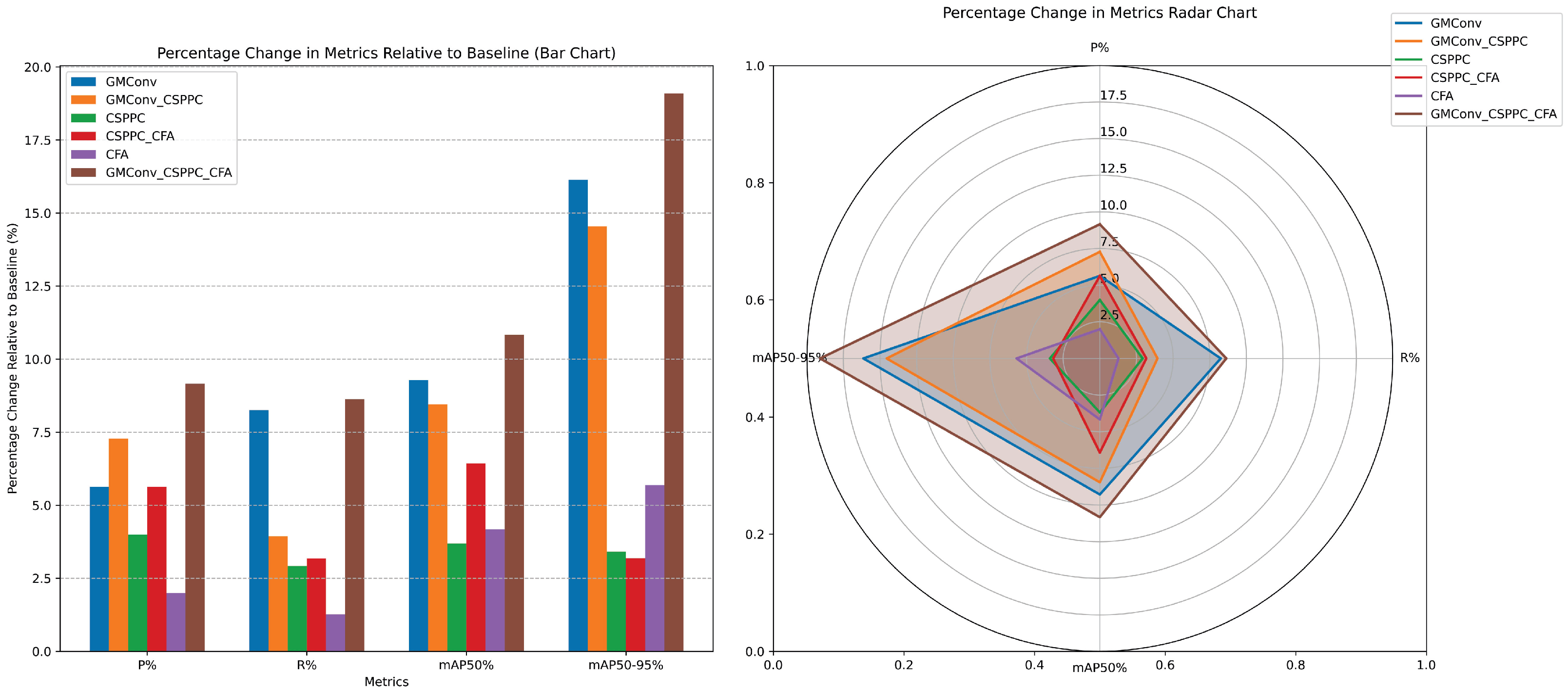 - Accuracy–Efficiency Trade-off: In the trade-off between parameters and computational cost, GMConv demonstrates outstanding efficiency. Its parameter count is 3.0 M, which is on par with the baseline model and PConv. In terms of computation, its GFLOPs are 4.3 G, only a minor increase compared to the baseline (4.0 G) and PConv (4.2 G). This minimal computational overhead (+0.3 GFLOPS) is exchanged for a substantial +7.8% increase in mAP@50, proving that the module is extremely efficient.