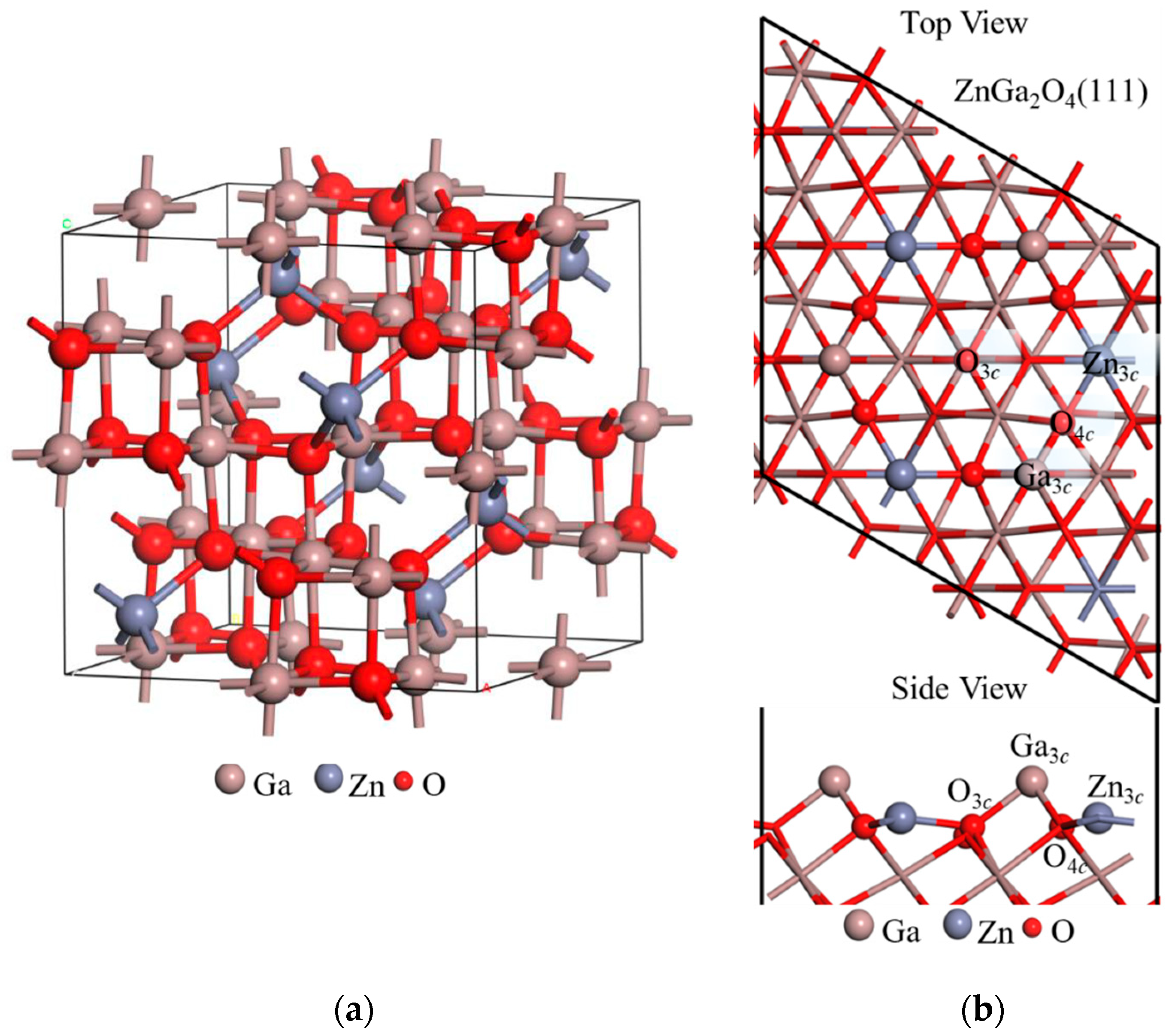 - Jia, C.; Fan, W.; Yang, F.; Zhao, X.; Sun, H.; Li, P.; Liu, L. A theoretical study of water adsorption and decomposition on low-index spinel ZnGa2O4 surfaces: Correlation between surface structure and photocatalytic properties. Langmuir 2013, 29, 7025–7037. [Google Scholar] [CrossRef]