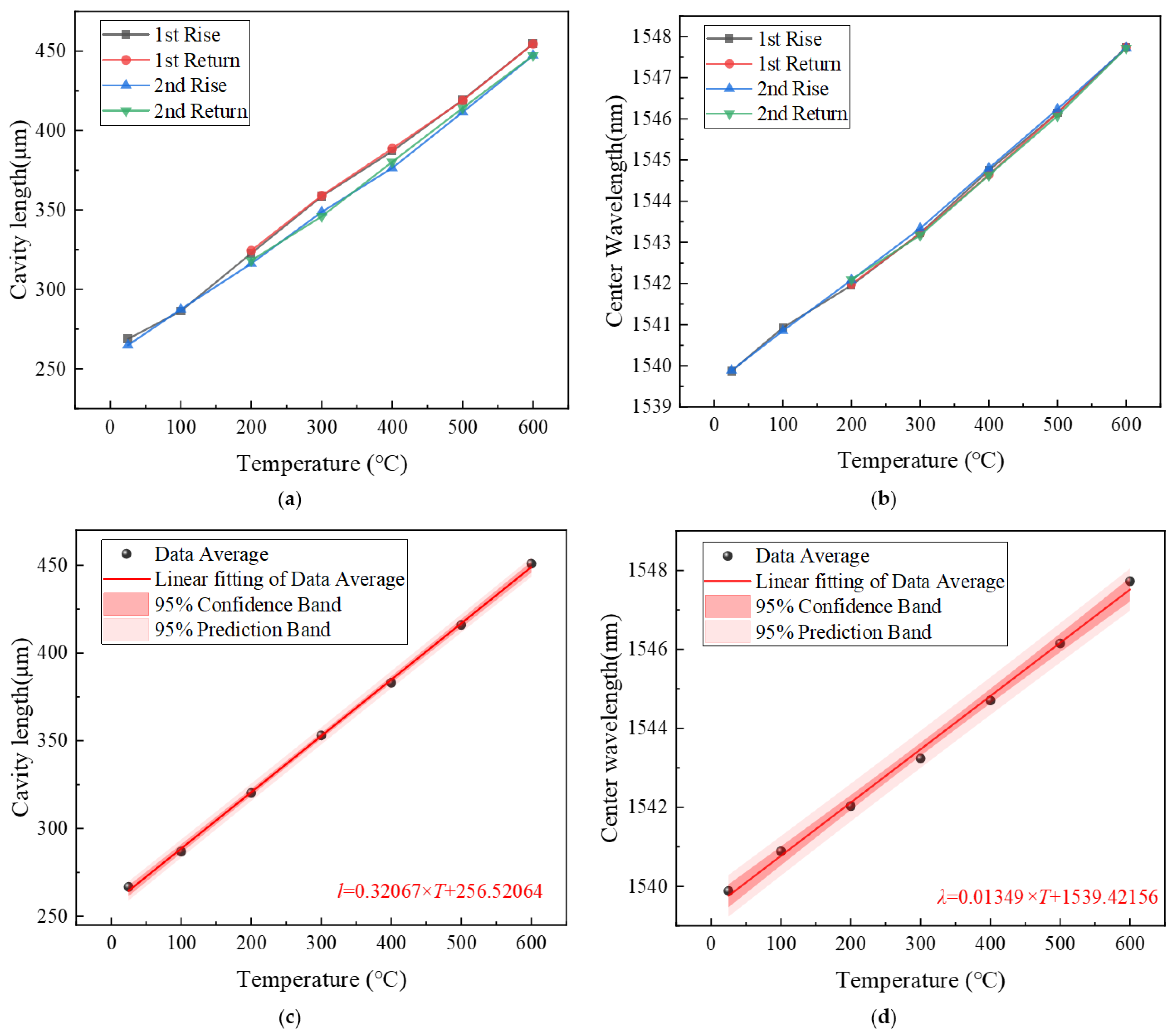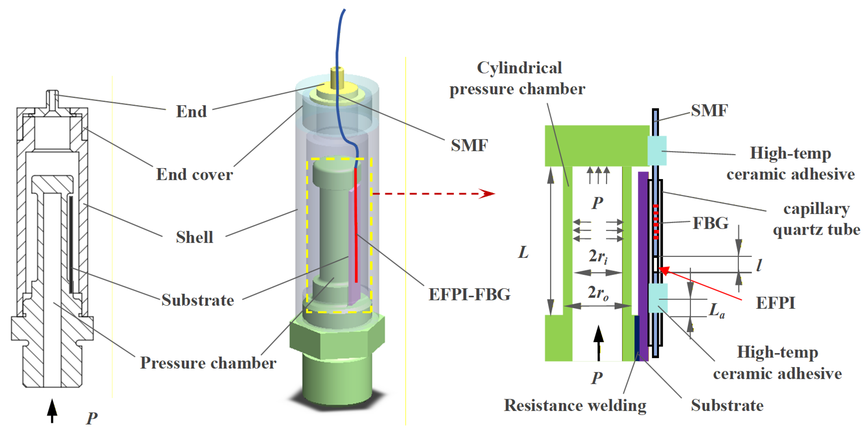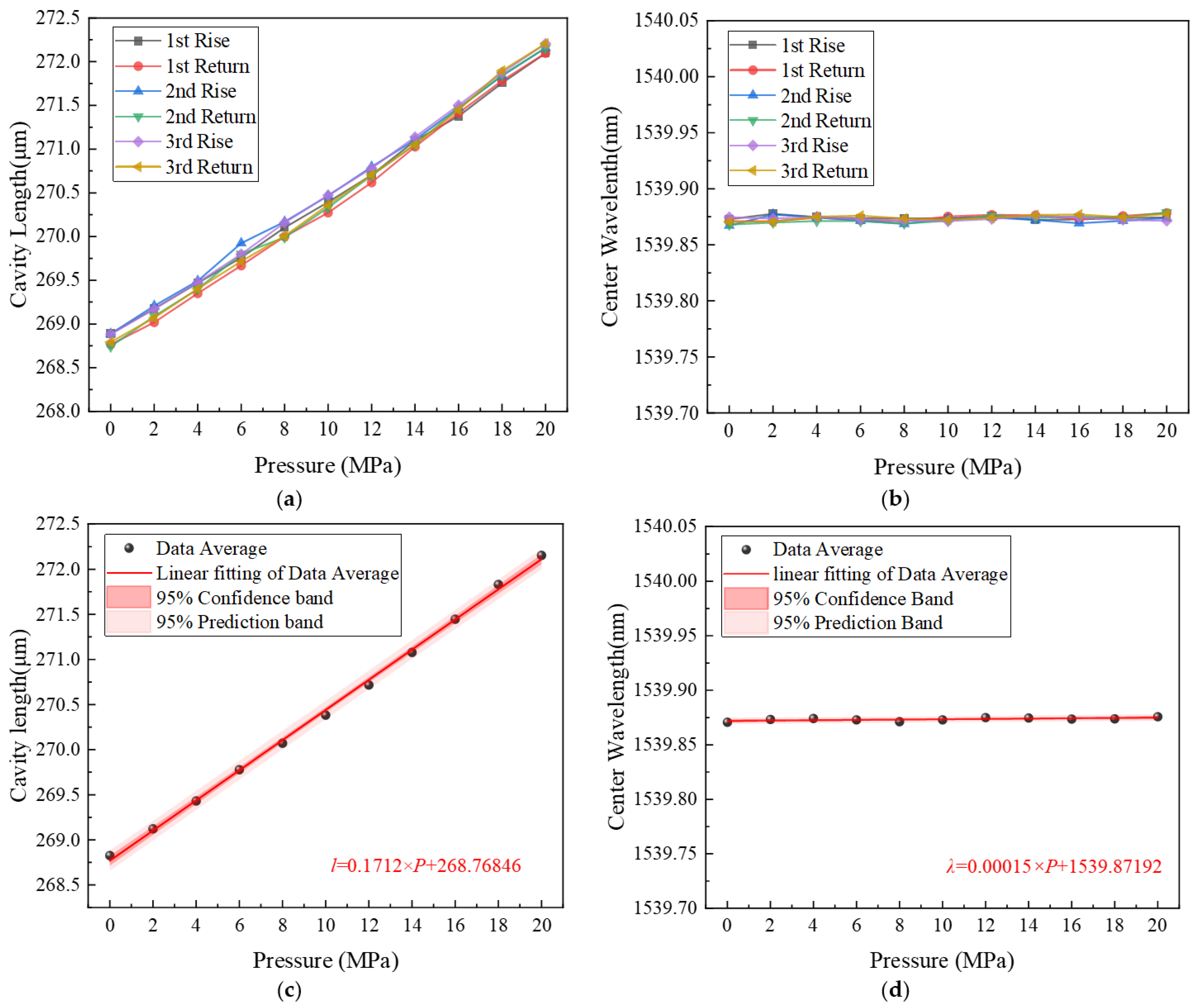 - By integrating an EFPI cavity for pressure sensing and an FBG with a floating end dedicated to temperature measurement, this design achieves clear functional separation. A decoupling matrix is established, enabling accurate dual-parameter measurement, which enhances measurement reliability in complex thermal-mechanical environments.