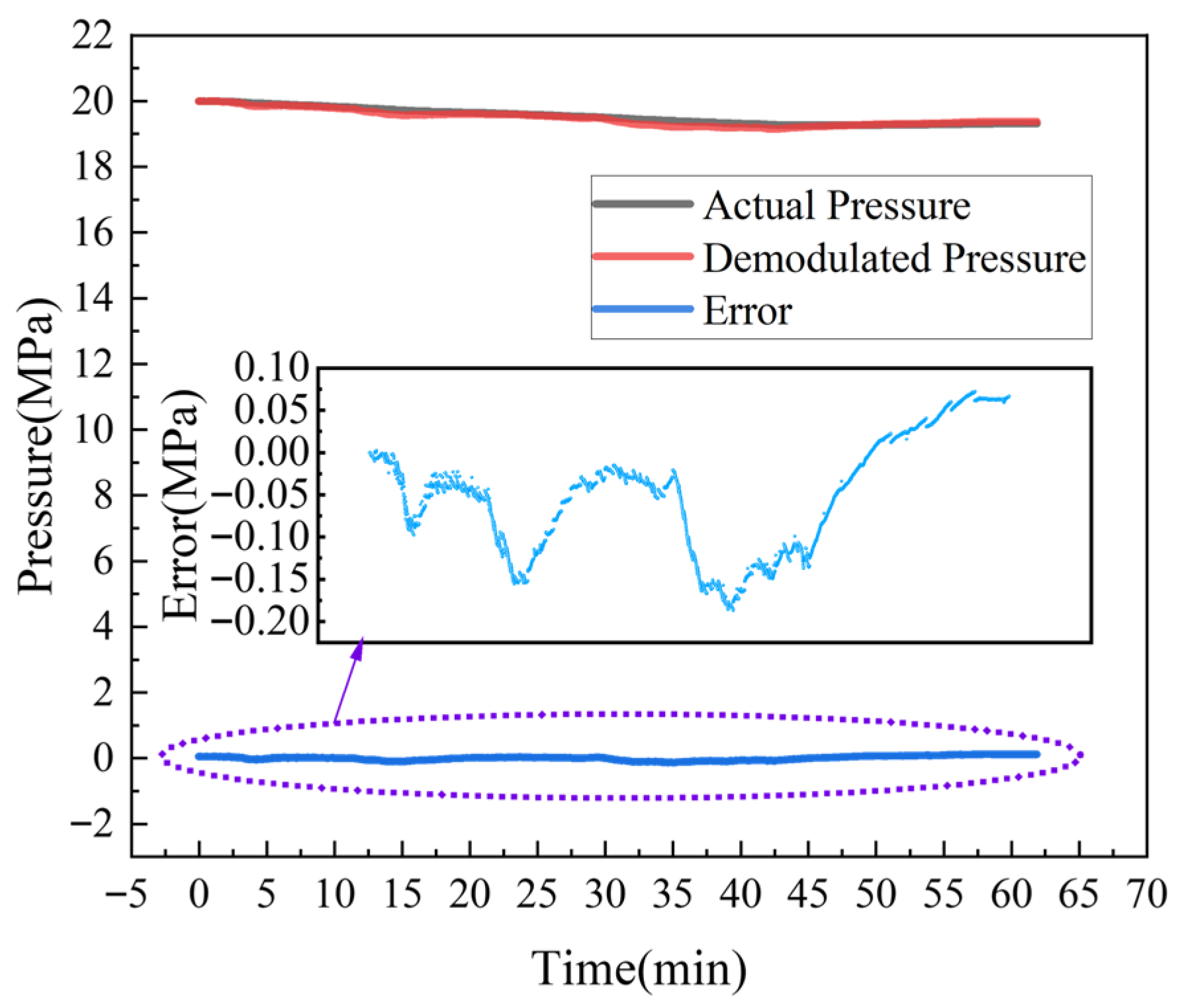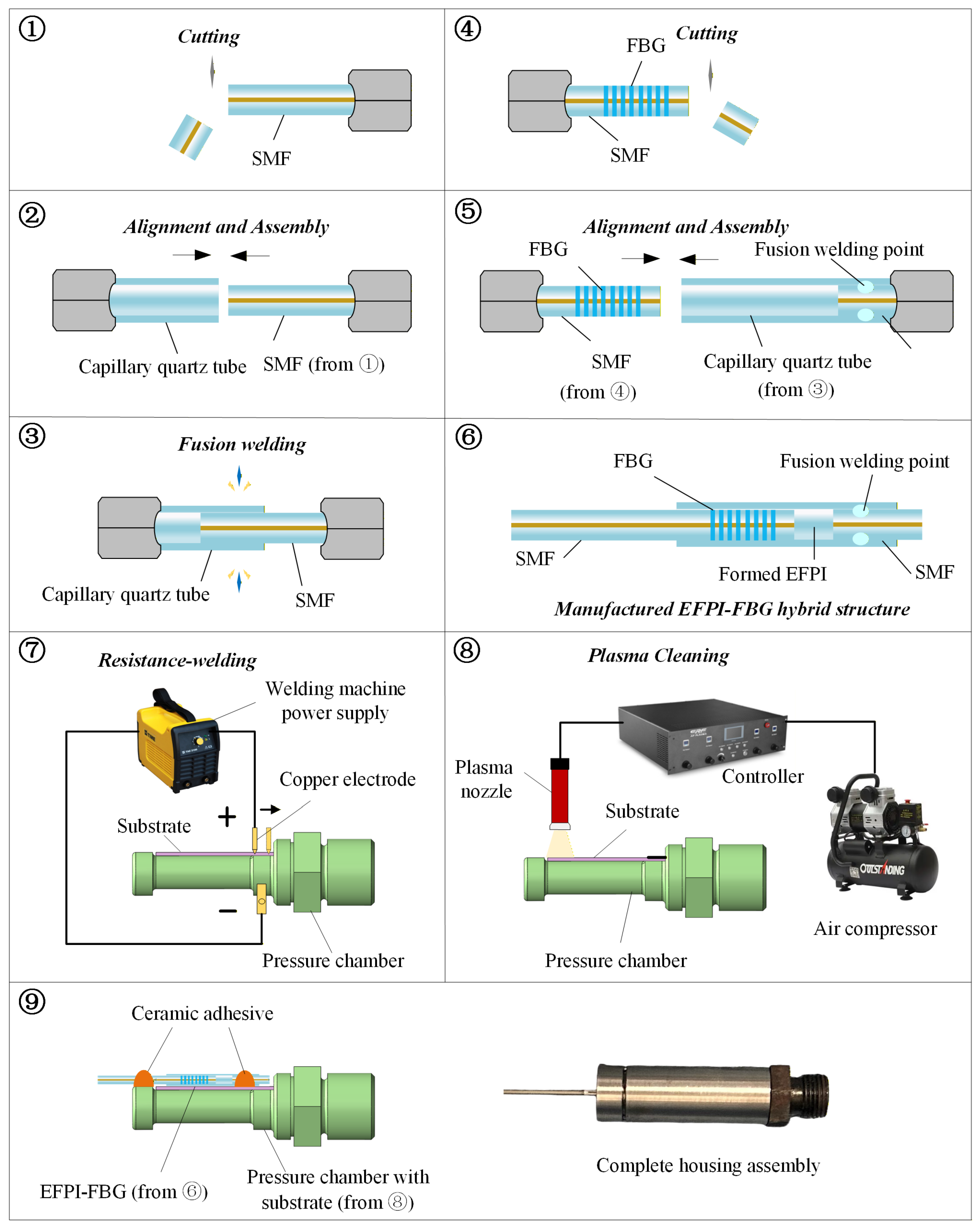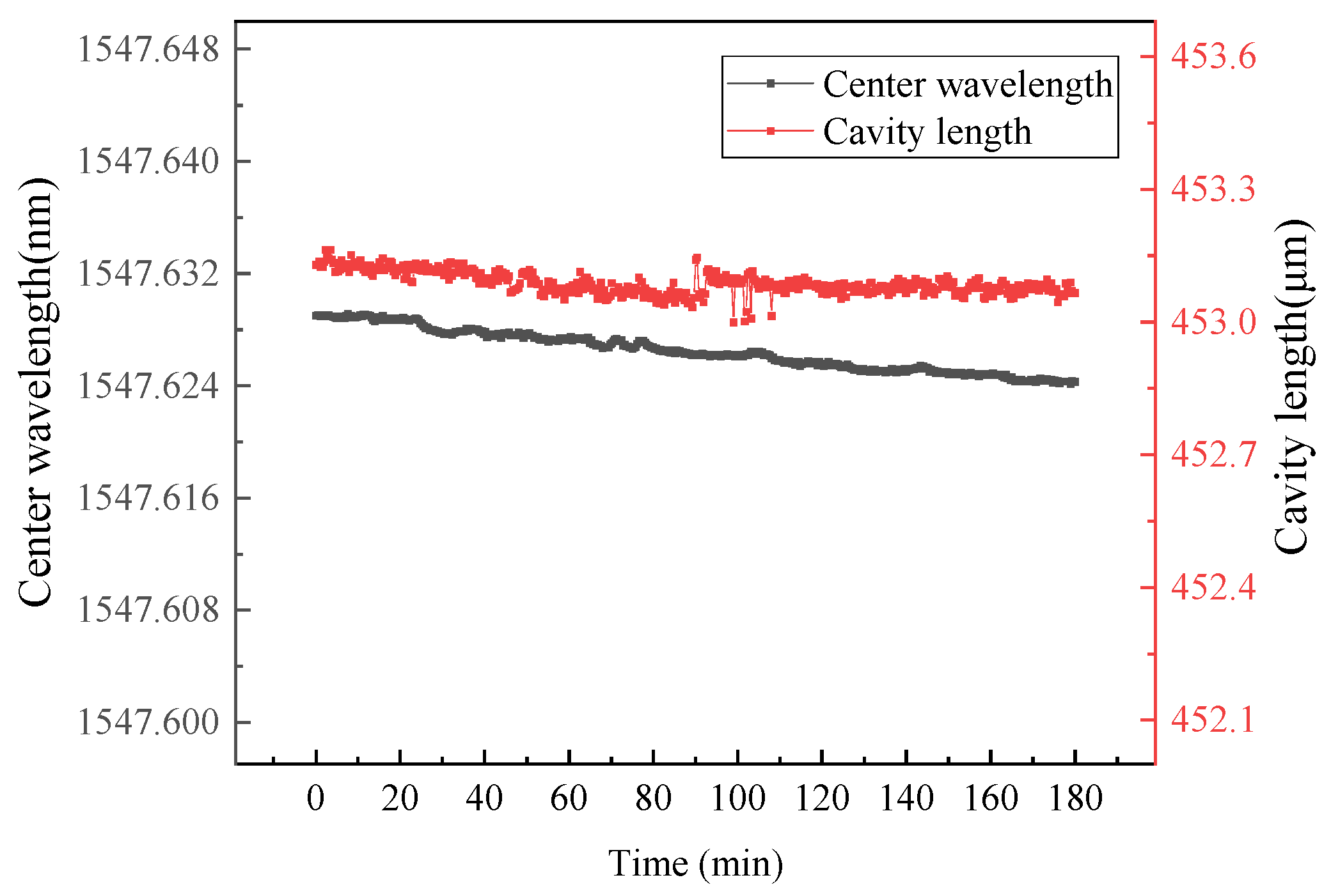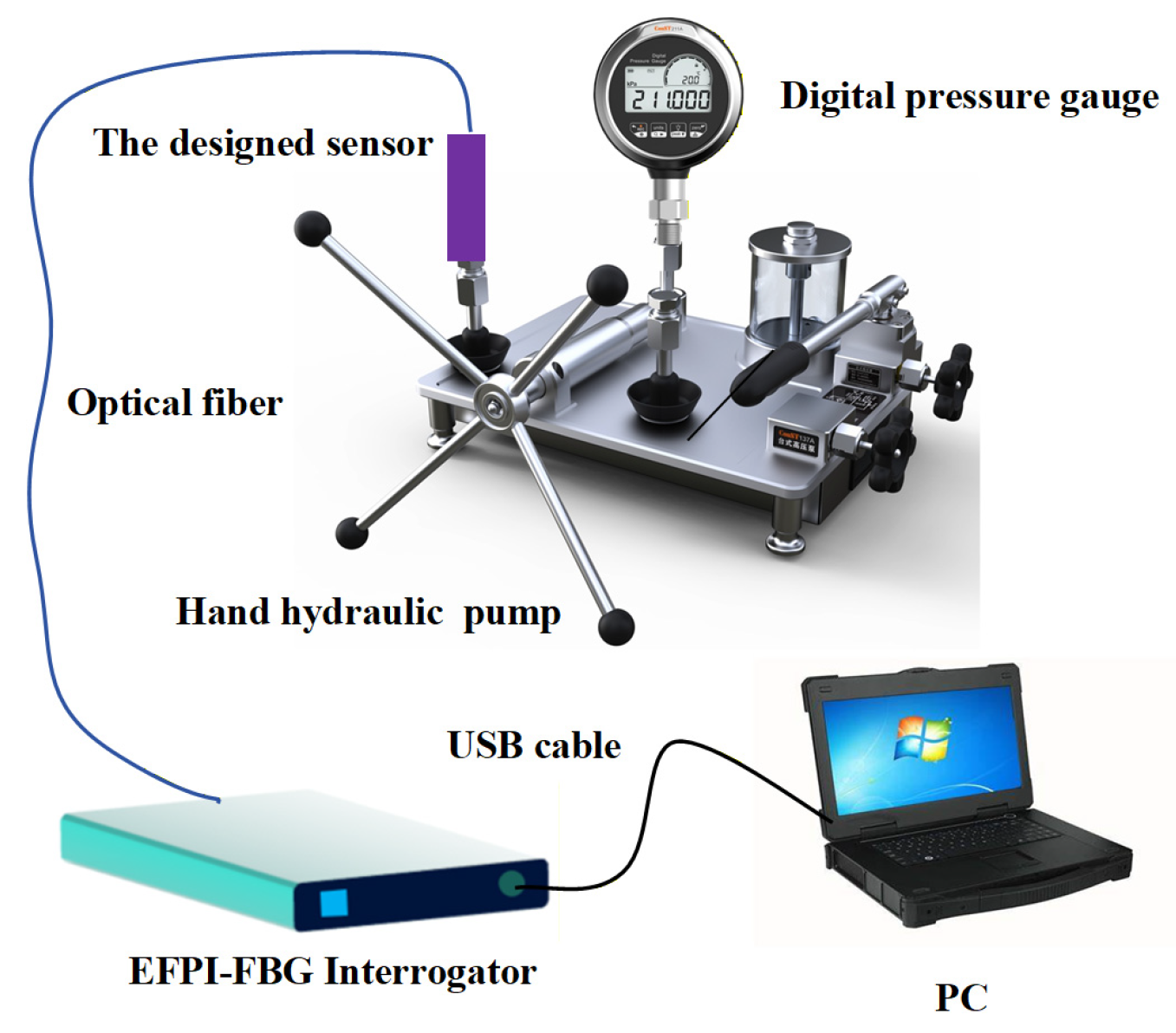 - By integrating an EFPI cavity for pressure sensing and an FBG with a floating end dedicated to temperature measurement, this design achieves clear functional separation. A decoupling matrix is established, enabling accurate dual-parameter measurement, which enhances measurement reliability in complex thermal-mechanical environments.