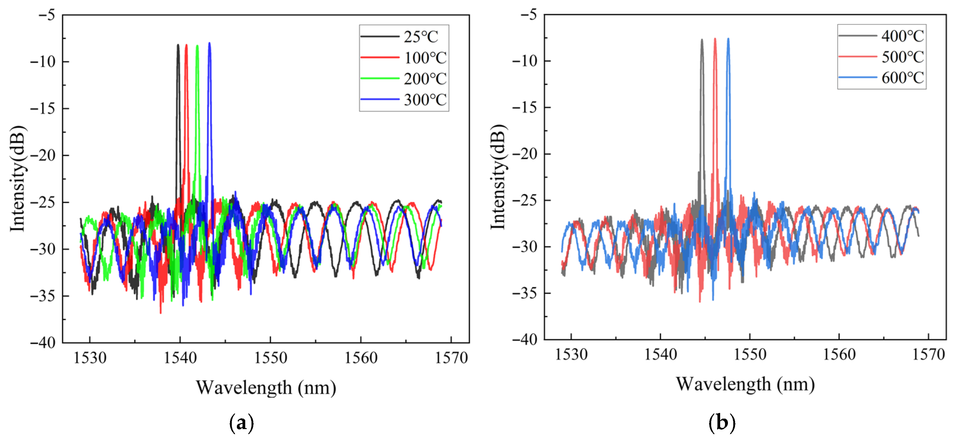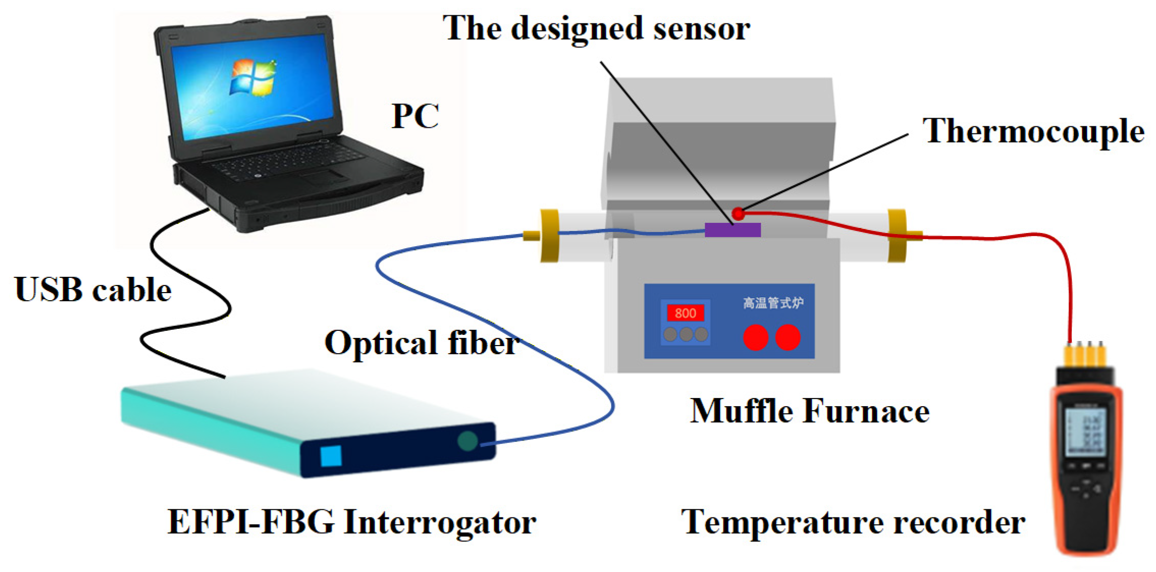 - Liao, Y.K.; Liu, J.; Dai, Y.T.; Wang, J.; Wan, S.; Zhang, L.; Wang, H.Y.; Jia, P.G. Temperature-Compensated Fiber-Optic Fabry-Perot Pressure Sensor Based on Sapphire MEMS Technology for High Temperature Environment up to 1500 °C. Opt. Express 2025, 33, 19453–19463. [Google Scholar] [CrossRef] [PubMed]