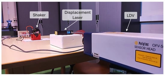 In addition to the LDV, uniaxial piezoelectric accelerometers from PCB Piezotronics Inc. (Depew, NY, USA) were employed, with sensitivities of 100 mV/g and 1 V/g. To validate the signal acquired by the vibrometer, a laser displacement sensor from Acuity (Atlanta, GA, USA) was also used. Furthermore, to ensure control over the initial excitation parameters, an electromechanical shaker capable of generating controlled frequencies was used.