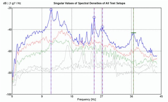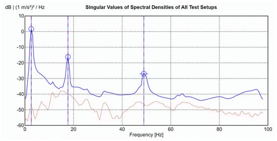 For each data set, the LDV was positioned perpendicular to the surface of the beam to measure velocity at the designated point. After measurement, the velocity signals from the LDV were both differentiated to obtain the accelerations at the corresponding points to work with all the signals in the acceleration domain. After acquiring both data sets, the results were combined in ARTeMIS Modal software (Version 8.0.1.7) to identify the natural frequencies and mode shapes of the beam using the Frequency Domain Decomposition (FDD) technique. To improve the low-frequency analysis—where the main structural modes are located—all response signals were decimated to a sampling frequency of 100 Hz before performing the modal identification. The singular value decomposition (SVD) for the FDD identification is presented in