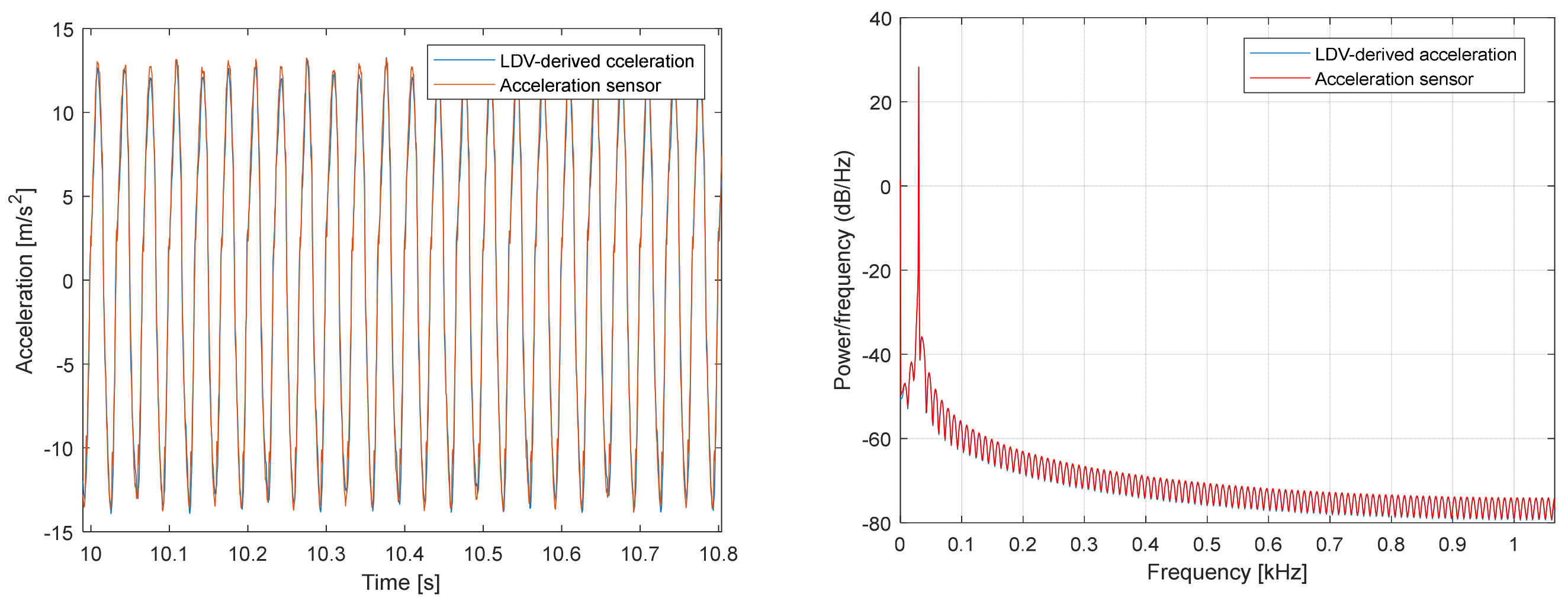 Figure 3 shows the acceleration-signal comparison for the 30 Hz sinusoidal motion of the electromechanical shaker. The two signals are practically identical (concordance correlation coefficient, CCC = 0.998; Pearson correlation coefficient, r = 0.998; normalized root-mean-square error, NRMSE = 0.019, ≈1.9% of the range).