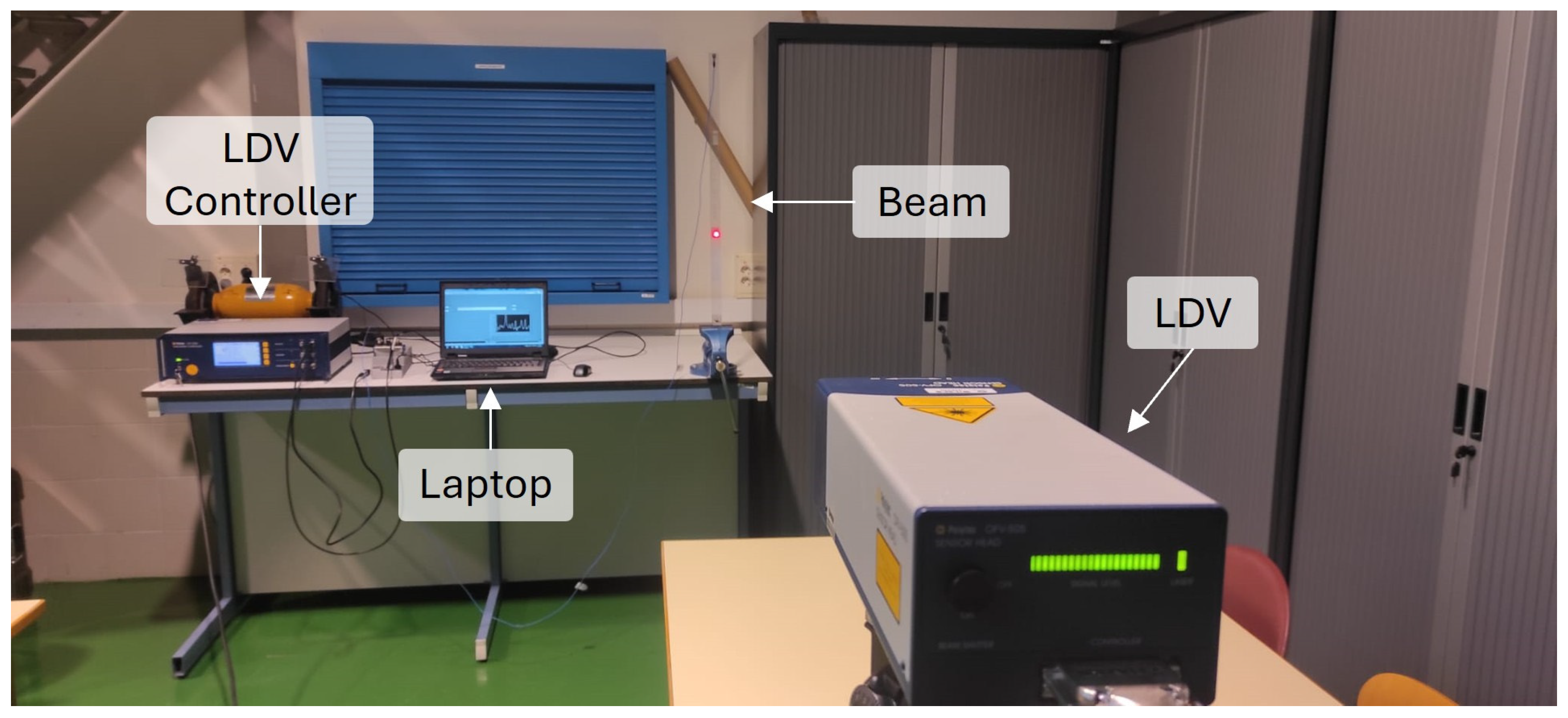 To verify this approach under controlled conditions, an electromechanical shaker was employed. A reflective target was placed on the shaker, and three types of sensors were simultaneously used: the LDV, the accelerometer, and the displacement laser (