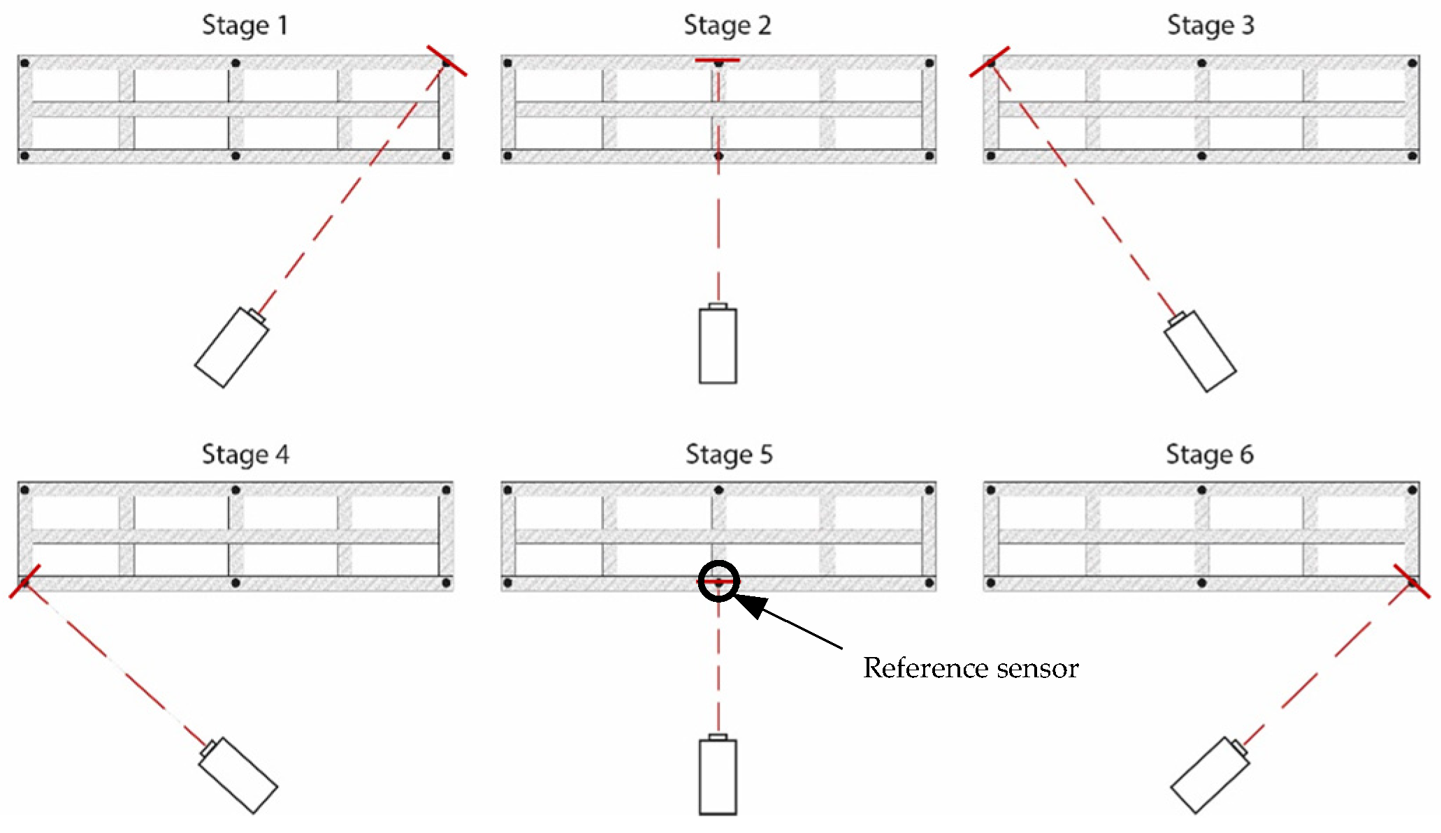 Figure 11), while the LDV was sequentially directed to the same six points to acquire velocity data. That is, each record therefore contains the same reference accelerometer channels plus one LDV channel (sequentially moved), and the LDV contribution is incorporated by using the reference accelerometer rather than by averaging the two systems In total, six data sets were necessary to measure the six points in the structure using the acceleration sensor at stage 5 as reference (see