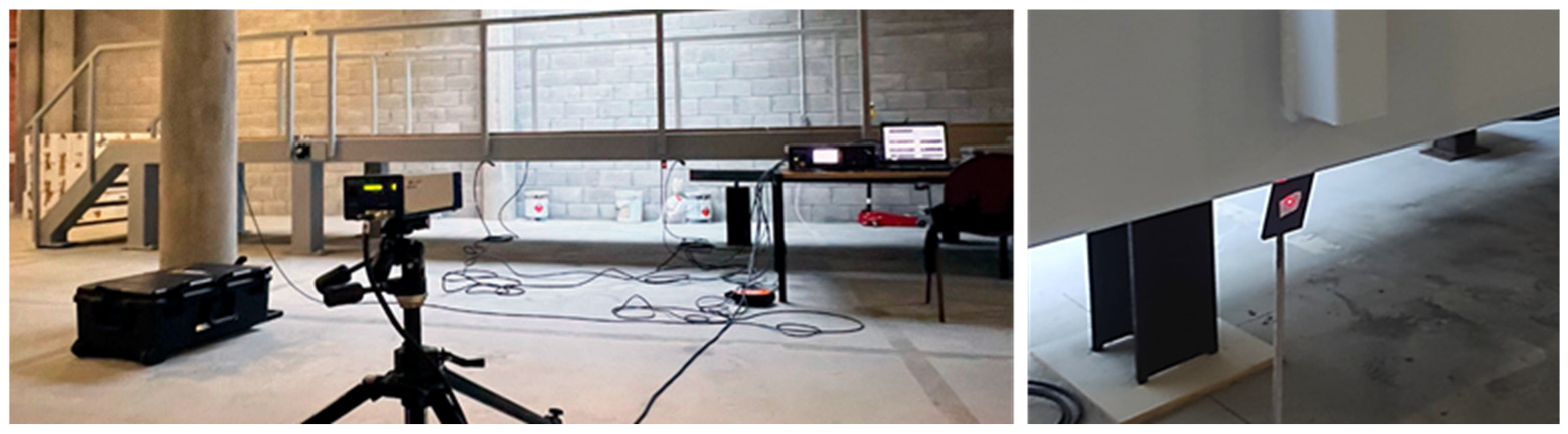 Figure 12). As this can be considered as a limit measurement situation, to improve the received laser measurement, reflective adhesive tape was used in the targets. This configuration reflects a scenario in which the vibration modes of interest are vertical, as typically observed in real bridges but the LDV cannot be operated directly aligned with the direction of movement, e.g., a bridge crossing a river, not accessible structure, etc.