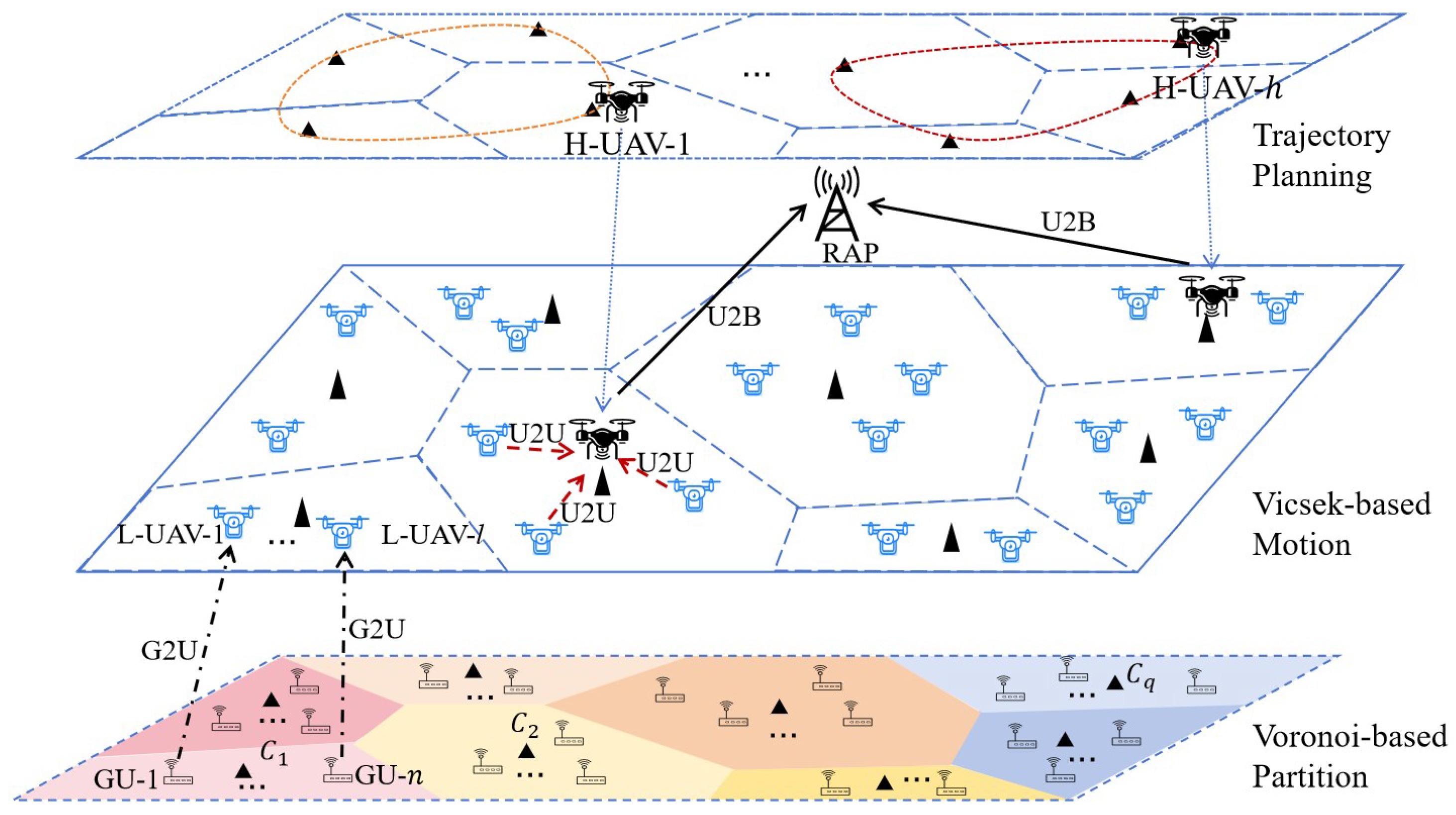 - Hierarchical heterogeneous UAV architecture: We design a two-tier framework where a small number of high-capability H-UAVs learn to coordinate regional coverage and manage large swarms of resource-constrained L-UAVs. This architecture naturally decomposes the complex global optimization problem into manageable subproblems while maintaining coordination through power–Voronoi partitioning that adapts to workload dynamics and UAV density.