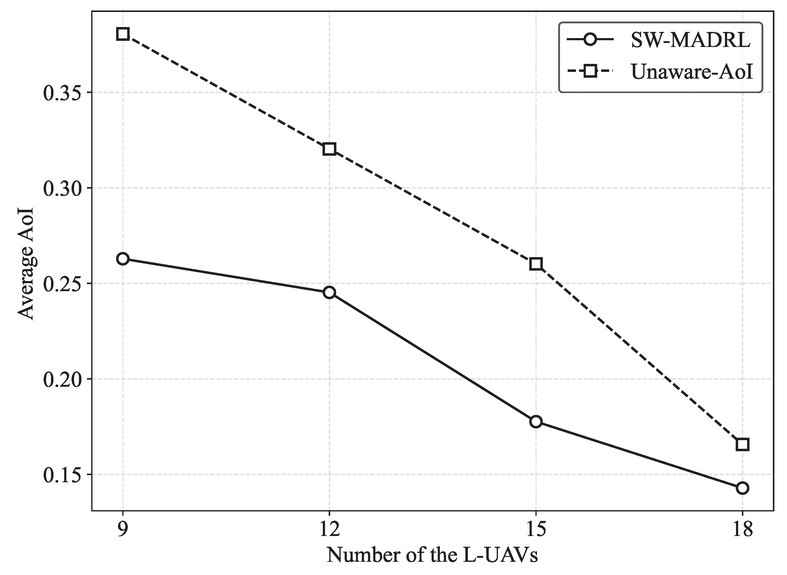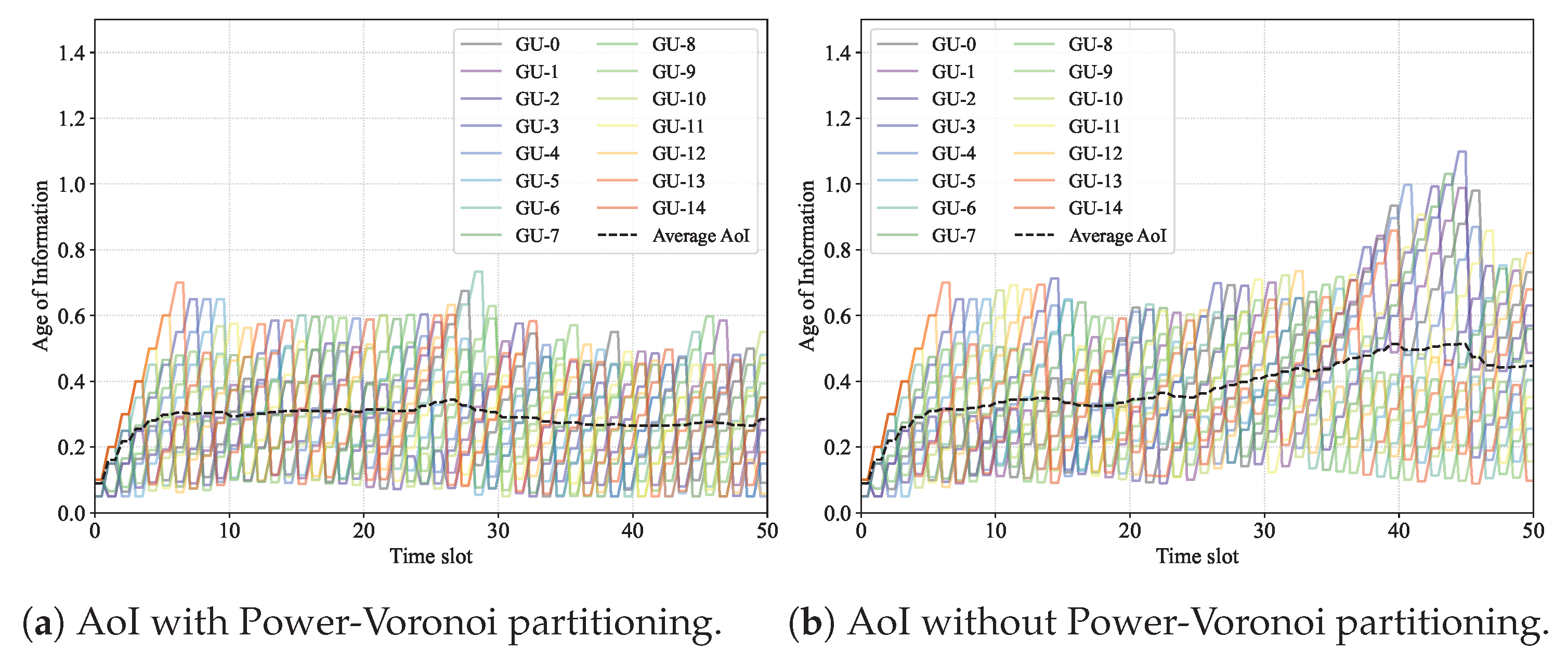 - Scalable self-organized L-UAV swarm control: We develop a weighted Vicsek model that incorporates task-specific factors, including the GUs’ AoI, wireless link quality, and congestion avoidance, to guide L-UAV motion within Voronoi cells. This decentralized mechanism requires only local information exchange, enabling efficient scaling to large-scale L-UAVs while achieving emergent collective behaviors such as coverage maximization and load balancing.