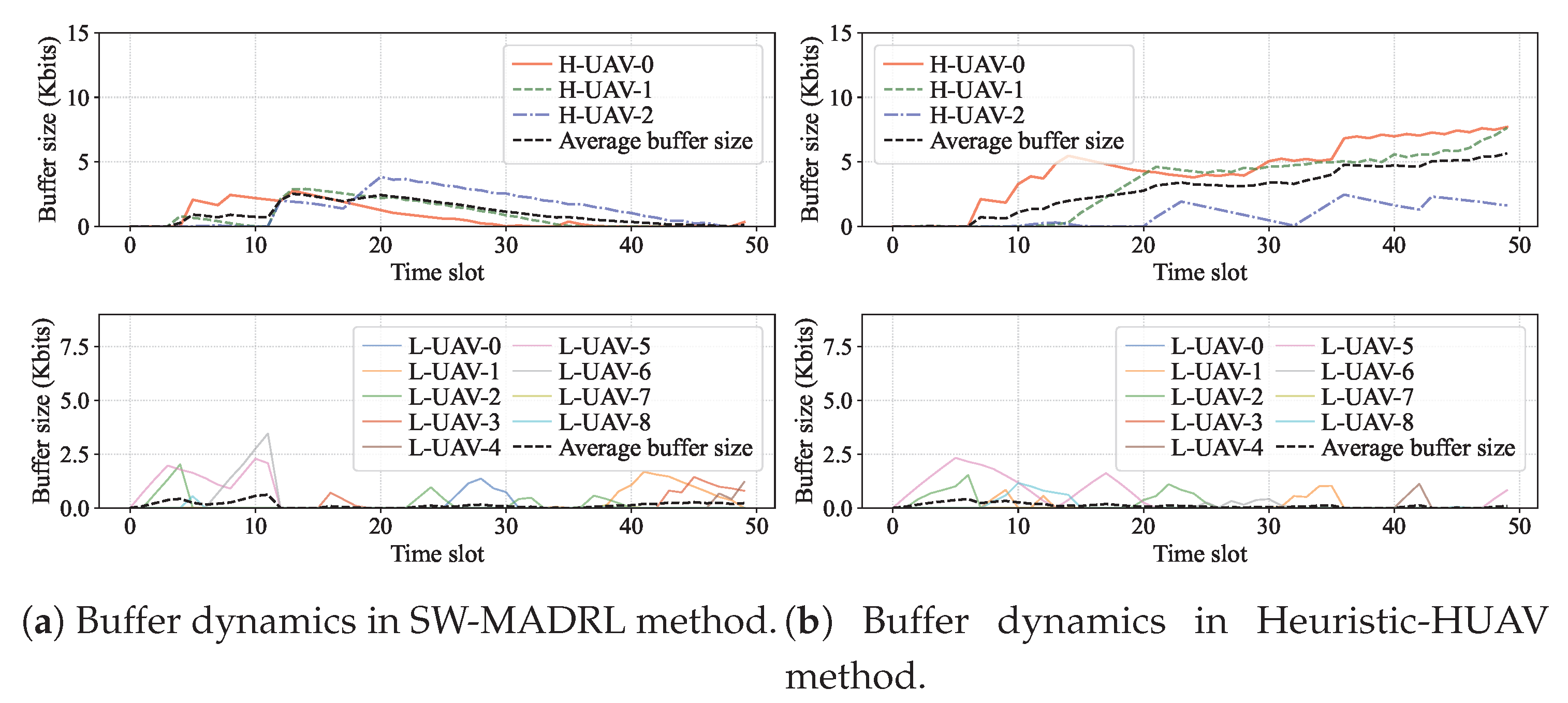 | , | Data queue length at L-UAV j and H-UAV k at time t |