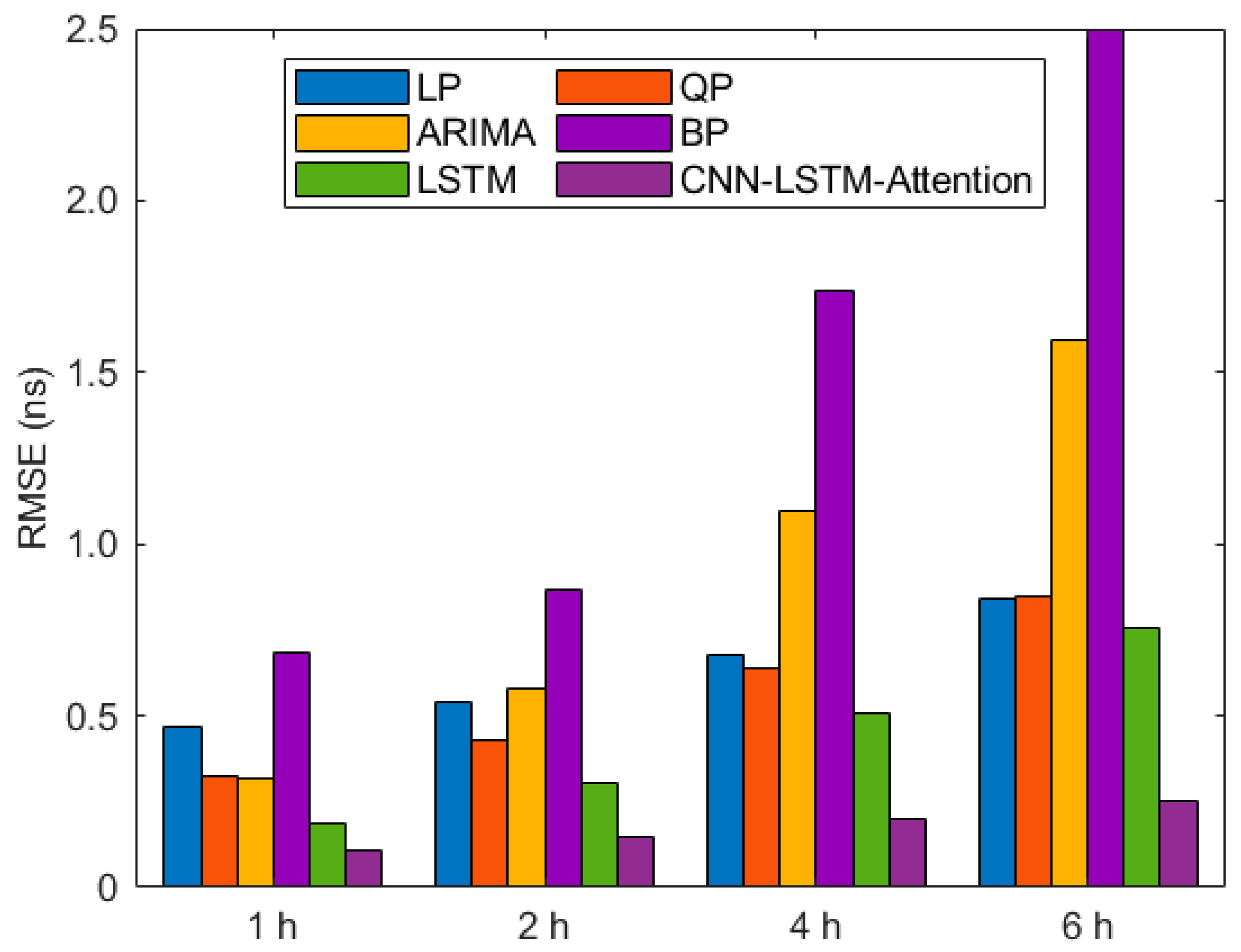 - Regarding both accuracy and stability, the CNN-LSTM-Attention model significantly outperforms all benchmark models (LP, QP, ARIMA, BP, LSTM). Furthermore, the model excels in short-term predictions and demonstrates remarkable stability in the long term, as the RMSE for most satellites stays below 1 ns.